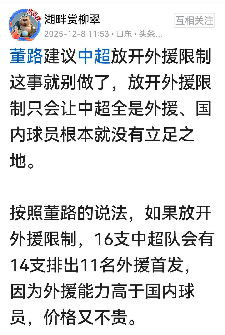 这次我赞同董路说的:放开外援限制,就没有国内球员立足之地。 当下中超再差的外援
