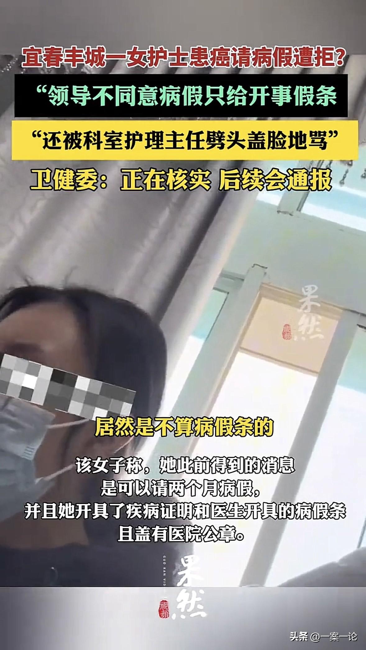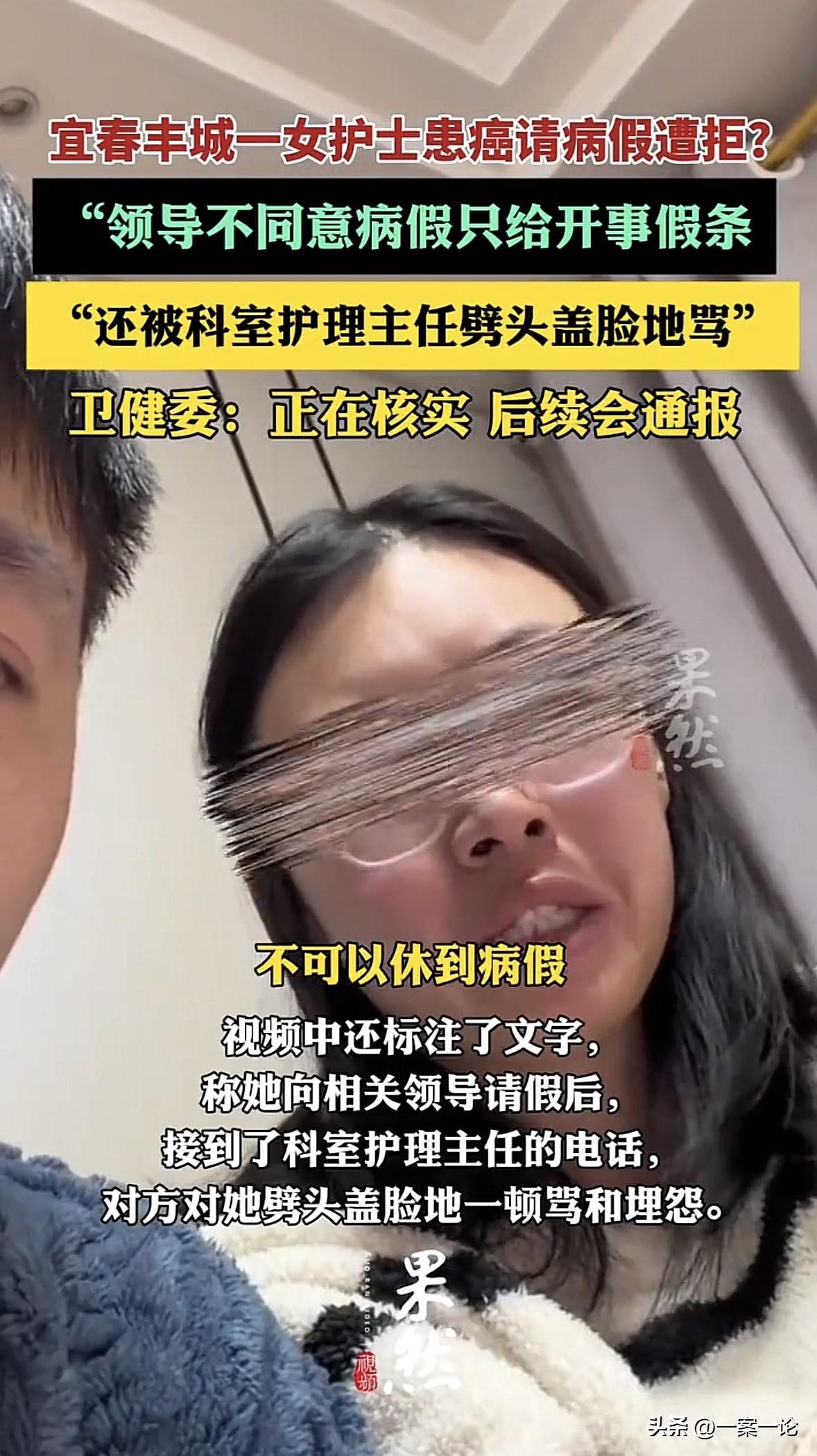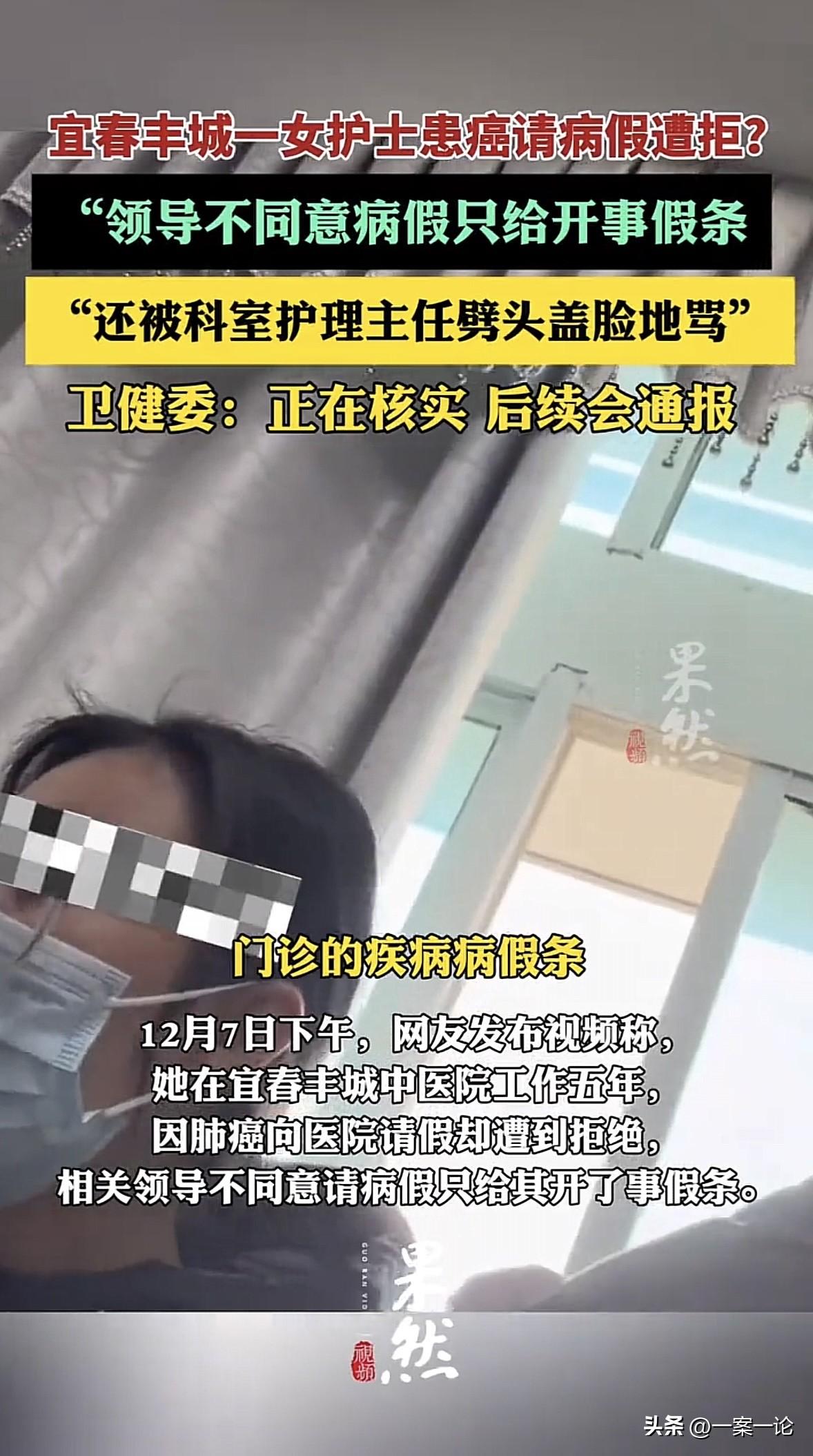 江西宜春,女护士在医院工作5年,经常连上夜班,她总感觉心慌喘不过气,一查竟是肺癌早期,她拿着诊断证明请假,领导却不批病假,只开了事假条,这意味着她拿不到病假工资,治疗期间也不受劳动法保护,不仅要面对经济压力,职业风险也增加了,然而,更让女子委屈的还在后面。 小林(化名)是医院里的一名护士,已经工作5年,干她们这行,工作强度并不低。 单拿小林自己的情况来说,她是负责ICU的,根据她的排班表,上2个月白班就要连上1个月夜班。 连上白班还好,可连上夜班那就不一样了,她的生物钟被完全打乱,非常熬人。 在这种强度下,小林有时上夜班会感到心慌喘不过气,她原以为是没睡好,可后面情况加重,她就去检查身体,结果竟查出肺癌早期。 看到这个结果,小林觉得天都塌了,这种情况下她肯定是不能再继续工作了,于是,她就拿着门诊开具的疾病证明和病假条向医院请假。 她本以为自己生这么大的病,医院于情于理都会批准她的病假,可院方却告诉她,门诊的病假条不算数,只能请事假。 小林听完内心委屈极了,她眼眶通红,声音都带着哭腔,说我在这工作5年了,尽职尽责,现在得了肺癌,连个病假都不给批吗? 而且,此前她曾询问过请假政策,得到的答复是可以请2个月病假,怎么如今就不作数了? 小林坐在医院办公室,情绪激动地和工作人员据理力争,她说:我做手术这么大的事,最后只能请1个月事假? 病假是法律给打工人的保障,医院自己定规矩不能比法律还大。小林拿着盖公章的病假条,就该享受病假待遇,不能因为“门诊”俩字就被卡住。 现在卫健委介入调查是好事,得查清楚医院为啥敢这么干?希望最后能给小林一个公道! 工作人员说,规定就是这样,门诊病假条不算病假。你要是觉得不人性化,咱再商量就是了,也不是非逼你上班,事假是可以批的。 这种“可以商量事假”的回应,在小林看来却像一记软钉子。 事假意味着没有病假工资,医疗期也不受劳动法保护,对于需要长期治疗的癌症患者来说,经济压力和职业风险都陡然增加。 请假遇阻已经让小林很是崩溃,没想到,更过分的还在后面。 小林请假后,接到科室护理主任的电话,对方不仅没有一句关心,还劈头盖脸一顿责骂,埋怨她关键时刻掉链子。 这种生病还要被指责的委屈,让小林想想都泪流不止,得了癌症已经够痛苦了,现在连基本的病假都请不到,她真是心凉了个彻底。 事后,小林把自己的遭遇发到了网上,很快引发大量关注。面对舆论发酵,工作人员回应称:她视频里只说了一部分,很多事情没说清楚。 目前对于这件事,卫健委已介入调查,院方表示后续会发布公告。 小林的遭遇,也是把医护群体的职业困境推到了台前。根据她提供的ICU排班表,护士们基本都是白班-夜班的循环模式,这就说明很多护士都长期处于睡眠不足、生物钟紊乱的状态,身体肯定会吃不消。 而且根据《中国医师执业状况白皮书》显示,三级医院医师平均每周工作时长超过60小时,超半数医师存在不同程度的职业倦怠。而长期高强度工作,正是许多医护人员健康亮红灯的诱因。 有人说,人命大于天,这个主任做事有点过分了,谁的命不是命?没轮到自己无法感同身受至少也得共情吧? 那么,医院以“门诊病假条不算病假”为由拒绝批假,是否合理? 《劳动部关于贯彻执行〈劳动法〉若干问题的意见》第59条规定:职工患病或非因工负伤治疗期间,在规定的医疗期内由企业按有关规定支付其病假工资或疾病救济费,病假工资或疾病救济费可以低于当地最低工资标准支付,但不能低于最低工资标准的80%。 医院以“门诊病假条不算病假”为由拒绝批假,直接违反了对医疗期权利的保护。 职工只要持有合法医疗机构出具的疾病诊断证明,无论门诊或住院开具,都享有法定医疗期待遇,包括病假工资保障。 医院单方面否定门诊病假条的效力,实质是剥夺了职工依法享受医疗期的权利。 法律没有对病假条的开具渠道作出限制性规定。只要医疗机构根据职工实际病情出具诊断证明并加盖公章,即具有法律效力。 医院以内部规定否定门诊病假条,属于变相设置额外门槛,违反“法定医疗期”的强制性规范。 根据规定,职工工作满5年可享受6个月医疗期。医院仅同意1个月事假,远低于法定标准,且事假期间不享受病假工资,直接侵害了职工的劳动权益。 对于这件事,你怎么看? 欢迎关注@一案一论