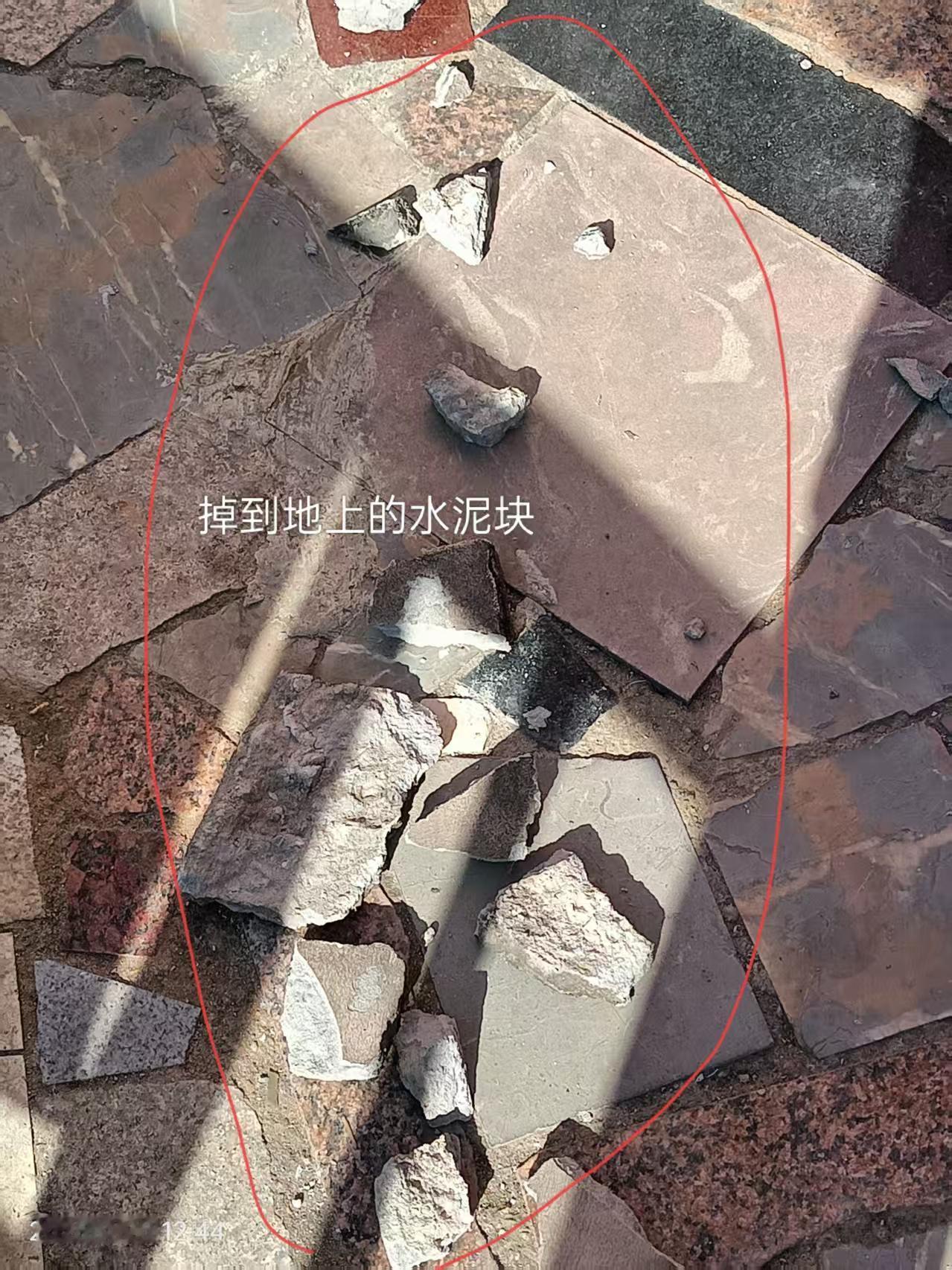 分享我这周有趣的事:昨天早晨,出门的时候还是好好的,中午回来就变成这样了。 好好的阳台晾晒架上面,有几块疑似外墙附着物的水泥块,到底是哪来的? 就在我抬头向上张望,寻找这几个水泥块的来源时,一个黑点朝我飞奔而来,我赶忙缩回脑袋。 几乎就在我缩回脑袋的同时, 那个黑点迅速从眼前划过,并落在了地面,发出清脆的撞击声。 我下楼一看,是一个小水泥块,真的吓出我一身冷汗,好险呀! 经我仔细观察,发现这几块水泥块,来自顶楼外墙边缘,因为业主安装阳光房使其松动 ,最终脱落。 这几天我没时间,我准备过几天去找物业,幸好没出大事,要是砸到人就麻烦了。