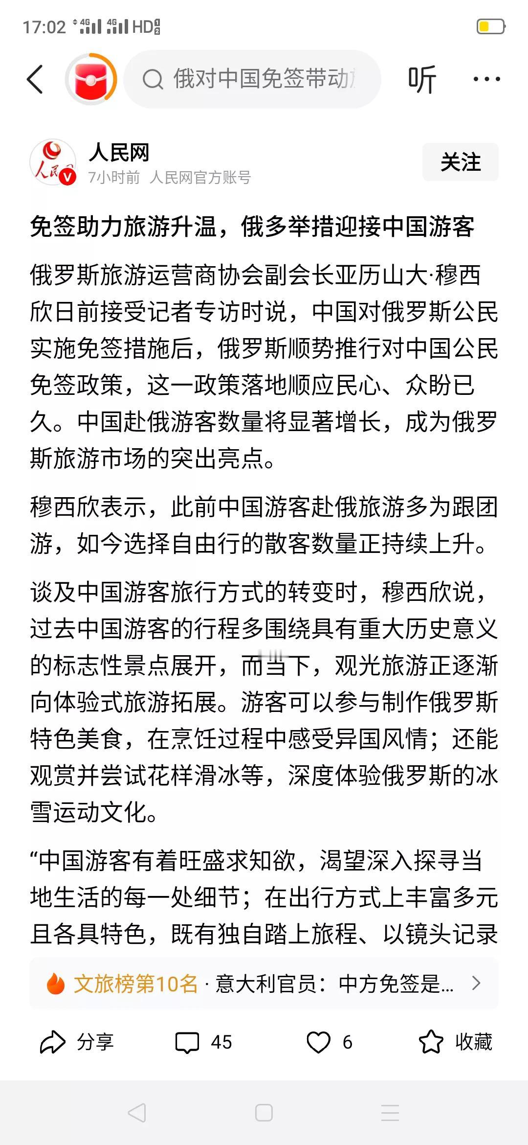今天,人民网亲自做宣传(下图),向国人喊话,为俄罗斯旅游助力; 另一方面,在前不久,中国驻柬埔寨汪文斌大使也亲自为柬埔寨旅游鼓与呼。让人感动。 尽管俄罗斯正处战争中,柬埔寨也陷电诈传闻。但官方的宣传表明,两个国家目前都很安全。 再者,俄罗斯和柬埔寨都是中国的友好国家,加强双方民间交流尤为重要。 古人所谓"危邦不入,乱邦不居",但有官媒背书,这两个国家都是优质旅游目的地,大家大可放心去。 朋友们,收拾行囊,准备出发吧!向北,向南,去寻找美的的风景和美好的际遇!