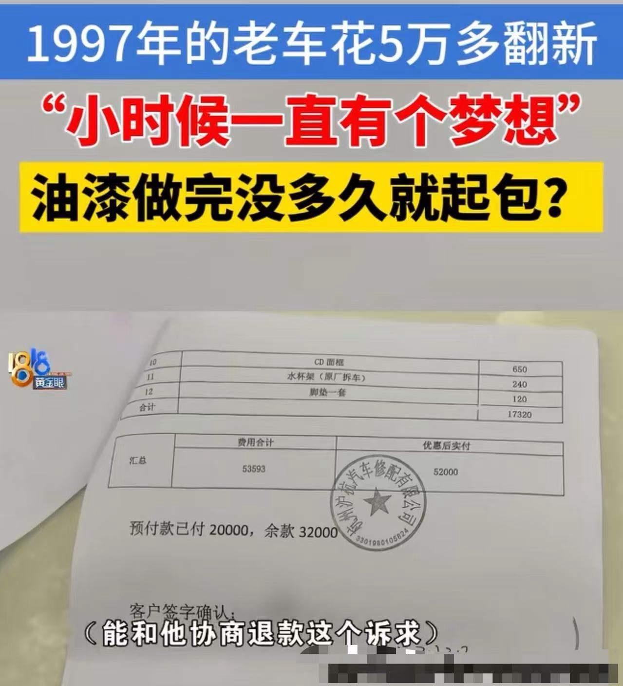 浙江杭州,男子年轻时一直有个梦想,就是开上1997年产的丰田佳美!为了实现了梦想,他 2013 年花 1 万 5买下了这台老爷车,现在想让这辆车开得更久,5 月份又花 52000 元 进行翻新整备。可开了几个月后,就出现油漆起包等问题,而维修店老板的说法,让他接受不了! 浙江杭州,一位普通男子的梦想,却折射出无数人心中的那份执着与坚持。年轻时,他曾梦想拥有一辆经典的丰田佳美,那不仅仅是一辆车,更是一段青春的记忆,一份对美好生活的向往。为了这个梦想,他用毕生积蓄,花了1万5千元买下了那台1997年的老车。或许在别人眼中,这只是一辆老旧的汽车,但在他心里,它代表着青春、希望和不屈的精神。 几年过去了,他没有放弃这份执念。为了让它焕发新生,去年5月,他又投入了5万2千元,进行全面翻新整备。每一笔花费,都凝聚着他对梦想的坚守,也彰显了他对生活的热爱。可是,令人心碎的是,刚开了几个月,车子就出现了油漆起包、掉漆等问题。更令人难以接受的是,维修店老板的态度,让他感受到了一种“被忽视”的失落。 这背后,折射出的是什么?是对梦想的坚持,还是对生活中那些“看似微不足道”的细节的忽视?或许,很多人都曾为某个梦想努力过,但在现实面前,却遭遇了不公平的对待。我们都在追求更好的生活,但当梦想遇到“现实的磨难”,我们是否还能坚持初心?是否还能像他一样,用行动去守护那份属于自己的美好? 更深层次地看,这个故事其实在告诉我们:梦想从来不是一蹴而就的,它需要我们用心去呵护。即使遇到挫折,也要学会从中汲取教训,而不是被动接受。每一次的失望,都是成长的契机。这个男子的坚持,或许只是一个普通人的缩影,但它折射出的是我们每个人心中那份不服输、不放弃的力量。 或许,我们也曾为一件小事而努力过,为了一份坚持而坚持。今天,他的故事提醒我们:无论梦想多么微小,只要你愿意付出,就值得被尊重。我们都在路上,或许前方还会遇到更多的挑战,但只要心怀梦想,脚步就不会停歇。 这,就是生活的真谛。不要因为一时的挫折就放弃那份热爱,因为每一次坚持,都是对自己最好的馈赠。让我们为这位“老车梦”的男子点赞,也为自己心中的那份坚持鼓掌。未来,也许就在不远的前方,等待着我们去迎接那份属于自己的光芒。佳美丰田