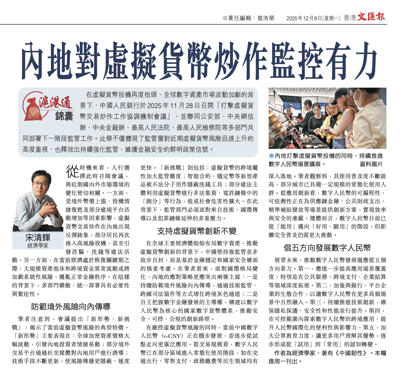 从时机来看,人行选择此时召开会议,与近期国内外市场环境的变化密切相关。一方面,受境外币价上涨、投机情绪复甦及部分违规平台活动增加等因素影响,虚拟货币交易炒作在内地出现反弹迹象,部分居民再次卷入高风险投机,甚至引发诈骗、洗钱等违法活动。另一方面,在当前经济处于恢复关键期之际,大规模资产泡沫和跨境资金异常流动或将加剧系统性风险,扰乱正常金融秩序。在这样的背景下,多部门联动、统一部署具有必要性与紧迫性。详见《香港文汇报》2025年12月8日B2。#经济学家宋清辉#