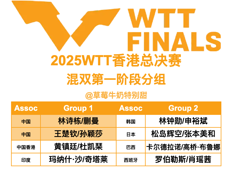 2025WTT香港总决赛丨混双第一阶段分组【Group 1】林诗栋/蒯曼🇨🇳、王楚钦/孙颖莎🇨🇳、黄镇廷/杜凯琹🇭🇰、玛纳什·沙/奇塔莱🇮🇳【Group 2】林钟勋/申裕斌🇰🇷、松岛辉空/张本美和🇯🇵、卡尔德拉诺/高桥·布鲁娜🇧🇷、罗伯勒斯/肖瑶茜🇪🇸