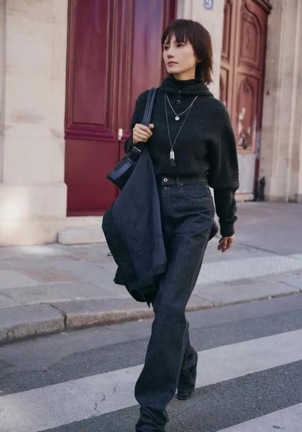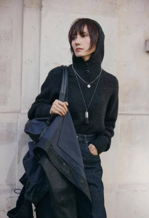 袁泉这“全黑穿搭”,把气质焊在骨子里了 谁能拒绝袁泉的松弛感?一身深灰连帽高领毛衣+黑牛仔阔腿裤,叠戴细链项链,连手插兜的动作都自带故事感。