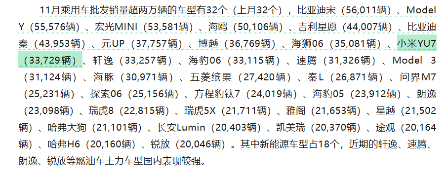 乘联会的数据来了,11月小米汽车交付46249辆,其中小米YU7为33729辆(10月YU7 33662辆),几乎没啥变化,看来小米汽车工厂的产能也就这么多了。。