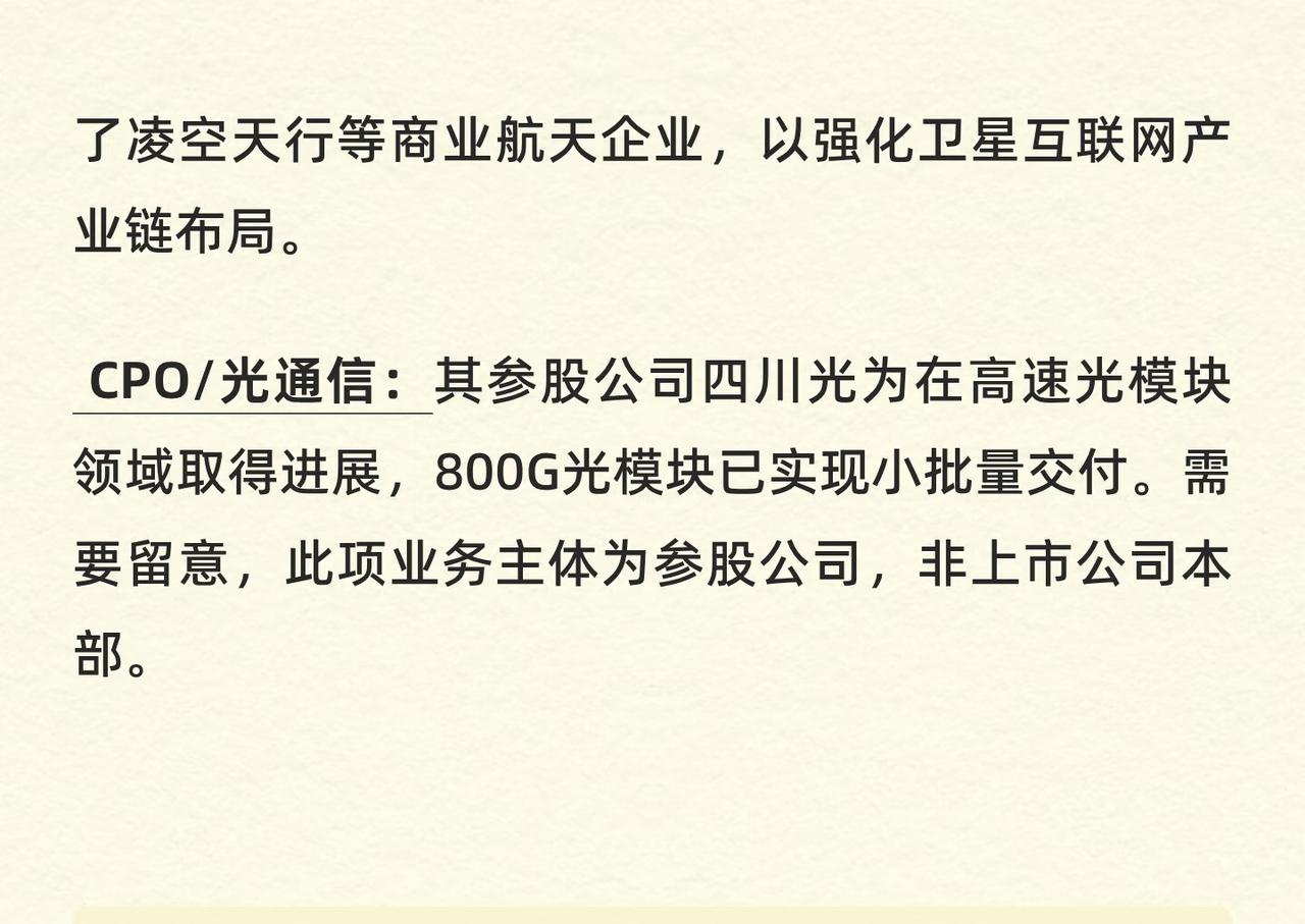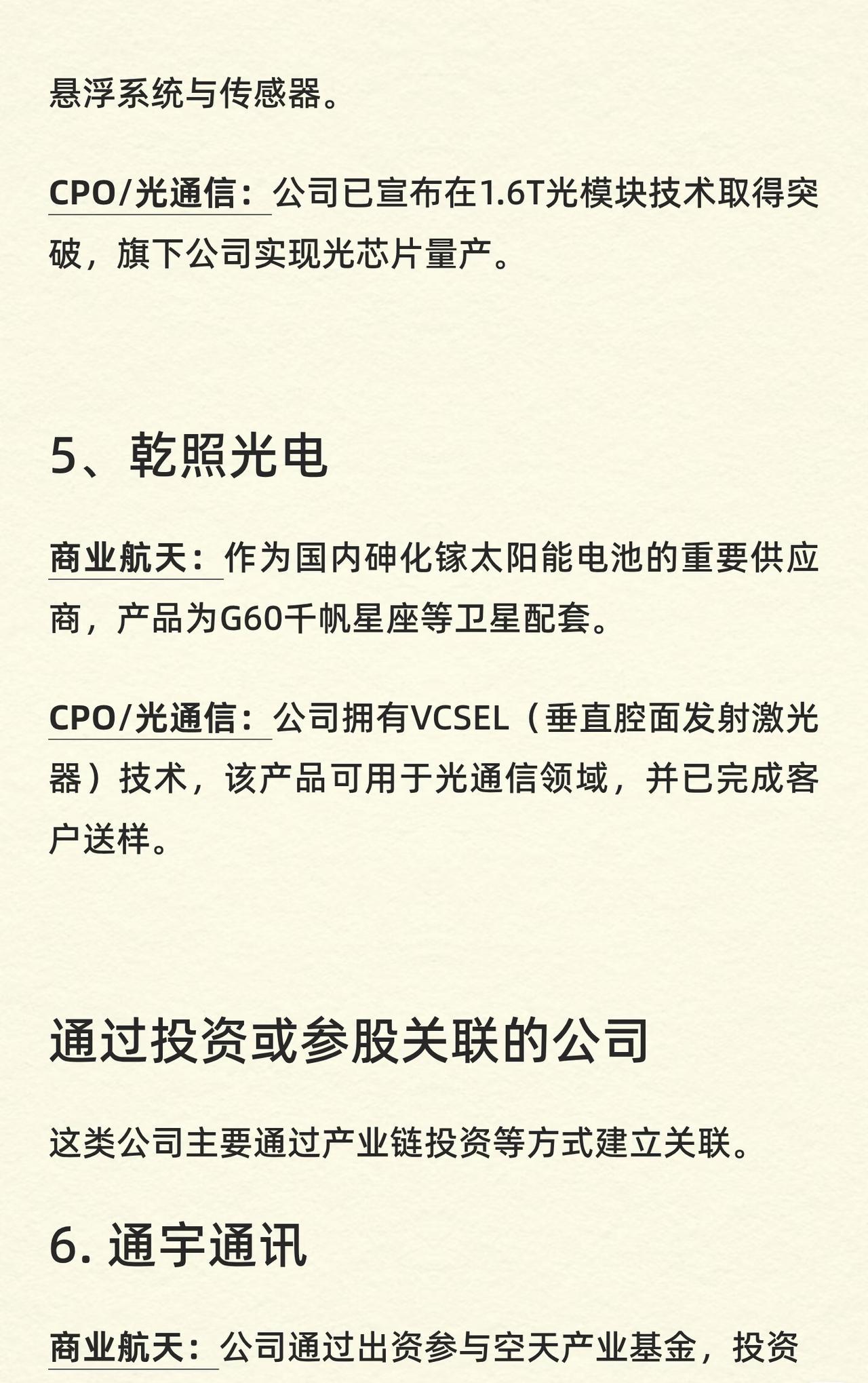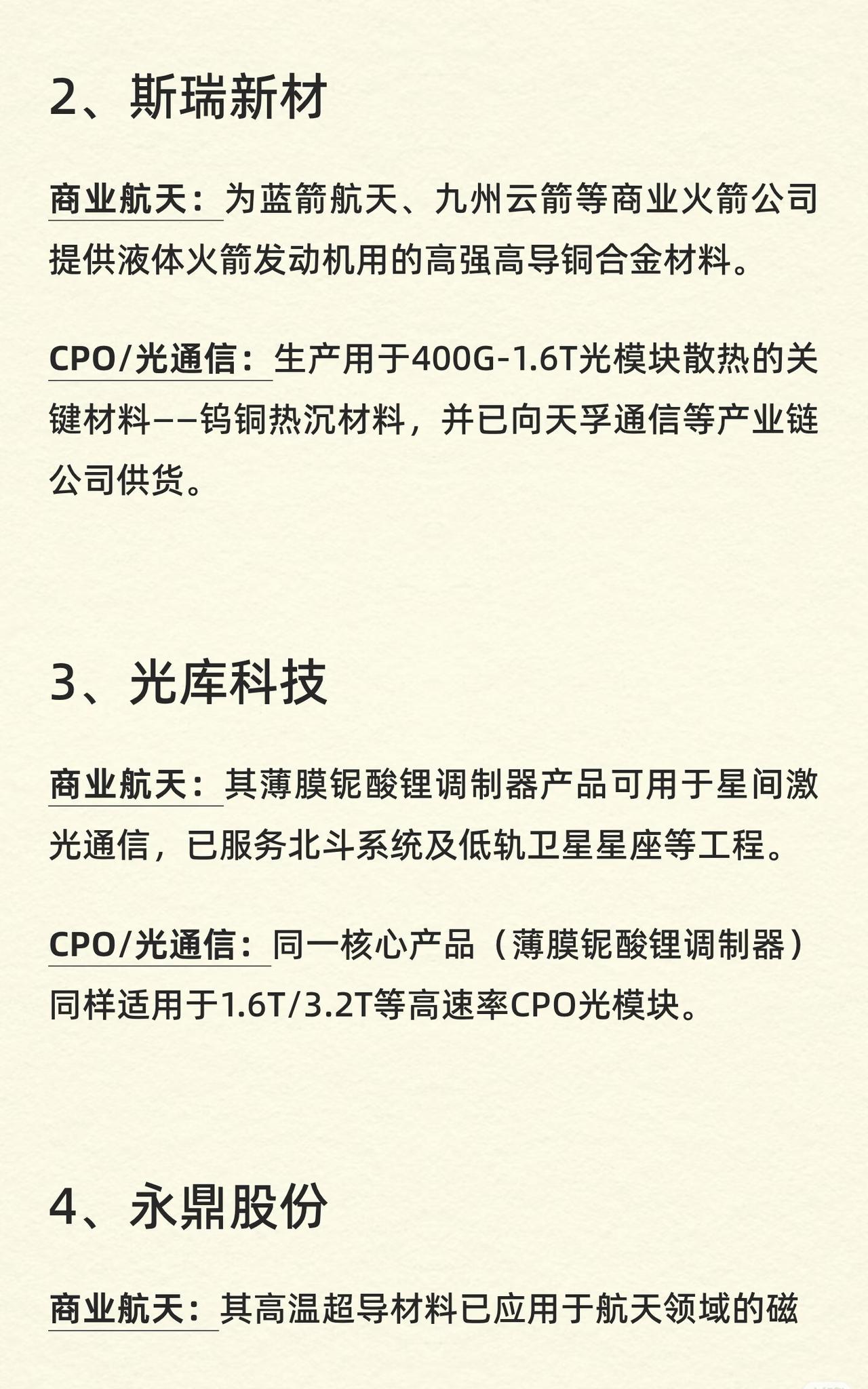 CPO(共封装光学)与商业航天是当前科技板块的两大主线,二者技术融合对推动太空通信与算力网络跨越式发展意义重大,基于公开信息梳理了6家在这两大领域均有业务布局的A股公司,具体情况如下: 长光华芯:商业航天方面,开发太空计算卫星星座的激光通信系统相关产品,参与国家某重大航天工程配套工作;CPO/光通信方面,主营业务为光芯片,量产100G EML芯片,200G EML芯片处于客户验证阶段,其光芯片技术是CPO方案基础之一。 斯瑞新材:商业航天方面,为蓝箭航天、九州云箭等商业火箭公司提供液体火箭发动机用的高强高导铜合金材料;CPO/光通信方面,生产用于400G-1.6T光模块散热的钨铜热沉材料,并向天孚通信等产业链公司供货。 光库科技:商业航天方面,薄膜铌酸锂调制器产品可用于星间激光通信,服务过北斗系统及低轨卫星星座等工程;CPO/光通信方面,同一核心产品(薄膜铌酸锂调制器)适用于1.6T/3.2T等高速率CPO光模块。 永鼎股份:商业航天方面,高温超导材料已应用于航天领域的磁相关场景。 另有公司(未明确名称):CPO/光通信方面,已在1.6T光模块技术取得突破,旗下公司实现光芯片量产。 乾照光电:商业航天方面,是国内砷化镓太阳能电池重要供应商,产品为G60千帆星座等卫星配套;CPO/光通信方面,拥有VCSEL(垂直腔面发射激光器)技术,产品用于光通信并已客户送样。 通宇通讯:商业航天方面,通过出资参与空天产业基金,投资凌空天行等商业航天企业,以强化卫星互联网产业链布局;CPO/光通信方面,其参股公司四川光为在高速光模块领域取得进展,800G光模块已实现小批量交付,需注意此项业务主体为参股公司,非上市公司本部。 此外,还有一类通过投资或参股关联的公司,主要通过产业链投资等方式建立与两大领域的关联。
