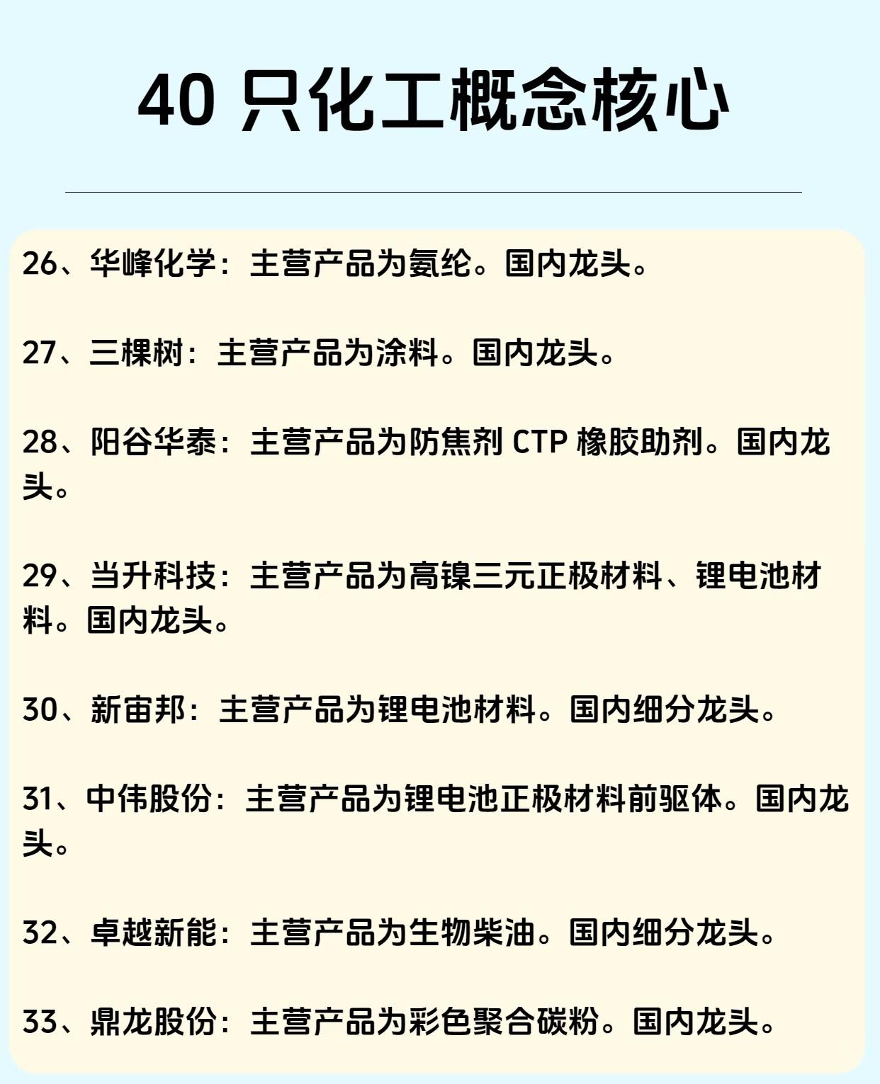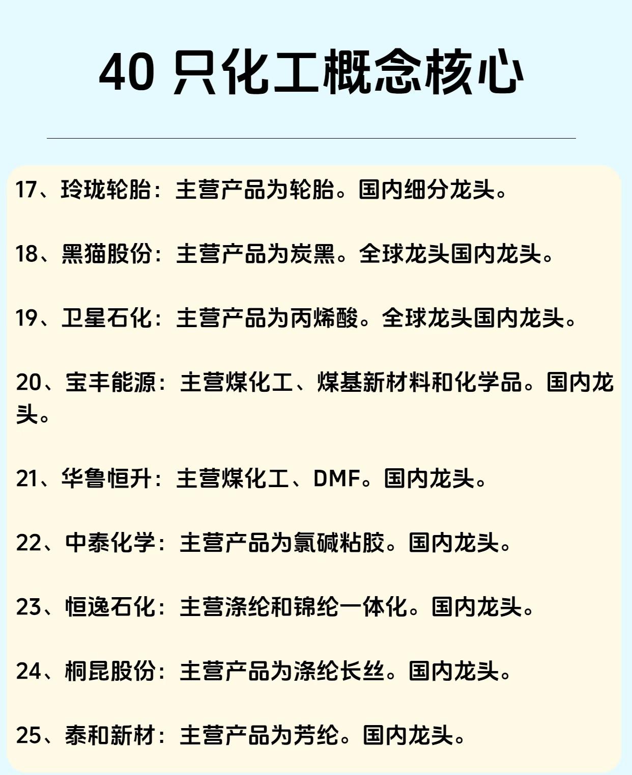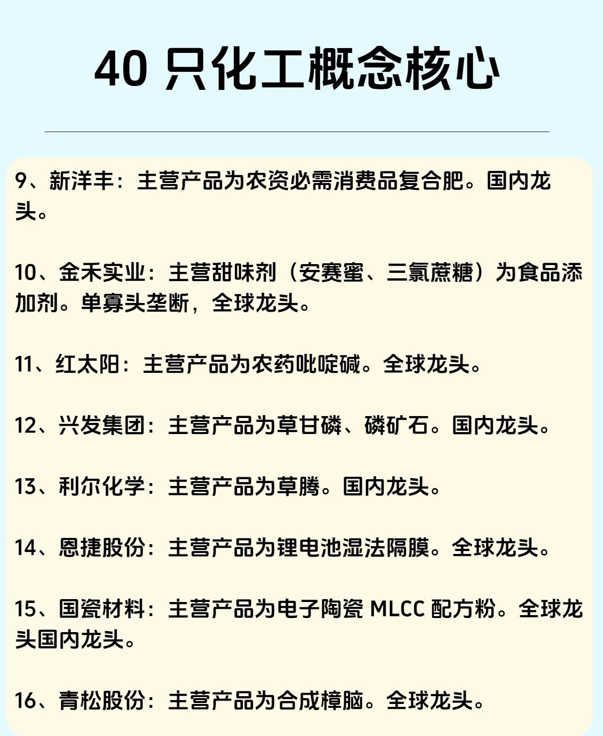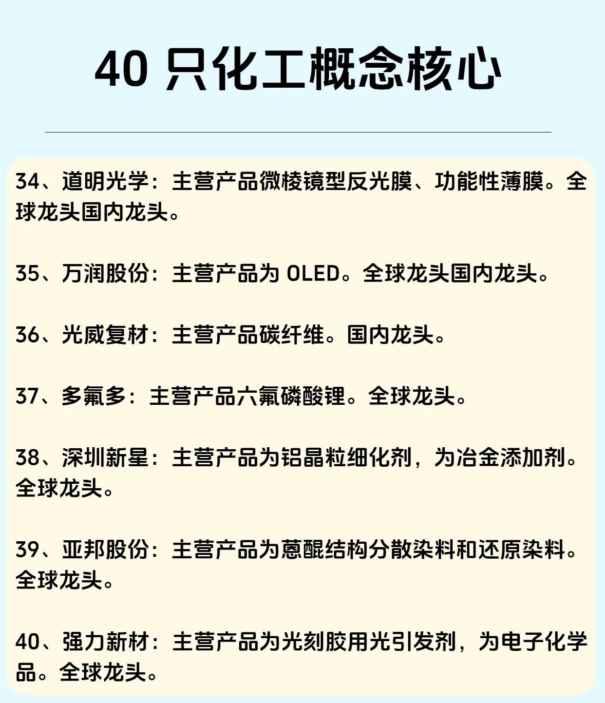 “40只化工概念核心”,系统梳理了化工行业内具有领先地位的企业信息。 第1张图涵盖1至8号企业,包括万华化学(MDI、TDI,全球及国内龙头)、恒力石化(传统炼化,国内民营龙头)、荣盛石化(聚酯纤维,国内龙头)、浙江龙盛(分散染料、活性染料,全球龙头)、龙蟒佰利(钛白粉,全球及国内龙头)、巨化股份(第三代氟制冷剂,全球及国内龙头)、安迪苏(蛋氨酸,全球及国内龙头)、扬农化工(农药菊酯,国内龙头)。 第2张图为9至16号企业,有新洋丰(复合肥,国内龙头)、金禾实业(甜味剂,全球单寡头垄断龙头)、红太阳(农药吡啶碱,全球龙头)、兴发集团(草甘膦、磷矿石,国内龙头)、利尔化学(草铵膦,国内龙头)、恩捷股份(锂电池湿法隔膜,全球龙头)、国瓷材料(电子陶瓷MLCC配方粉,全球及国内龙头)、青松股份(合成樟脑,全球龙头)。 第3张图为17至25号企业,涉及玲珑轮胎(轮胎,国内细分龙头)、黑猫股份(炭黑,全球及国内龙头)、卫星石化(丙烯酸,全球及国内龙头)、宝丰能源(煤化工及煤基新材料,国内龙头)、华鲁恒升(煤化工、DMF,国内龙头)、中泰化学(氯碱粘胶,国内龙头)、恒逸石化(涤纶和锦纶一体化,国内龙头)、桐昆股份(涤纶长丝,国内龙头)、泰和新材(芳纶,国内龙头)。 第4张图为26至33号企业,包括华峰化学(氨纶,国内龙头)、三棵树(涂料,国内龙头)、阳谷华泰(防焦剂CTP橡胶助剂,国内龙头)、当升科技(高镍三元正极材料、锂电池材料,国内龙头)、新宙邦(锂电池材料,国内细分龙头)、中伟股份(锂电池正极材料前驱体,国内龙头)、卓越新能(生物柴油,国内细分龙头)、鼎龙股份(彩色聚合碳粉,国内龙头)。 第5张图为34至40号企业,有道明光学(微棱镜型反光膜、功能性薄膜,全球及国内龙头)、万润股份(OLED,全球及国内龙头)、光威复材(碳纤维,国内龙头)、多氟多(六氟磷酸锂,全球龙头)、深圳新星(铝晶粒细化剂,全球龙头)、亚邦股份(蒽醌结构分散染料和还原染料,全球龙头)、强力新材(光刻胶用光引发剂,全球龙头)。 整体来看,这40家企业覆盖精细化工、基础化工、新材料、新能源相关化工品等多个细分领域,许多在全球或国内占据龙头地位,体现了化工产业的核心竞争力与产业链关键环节布局。