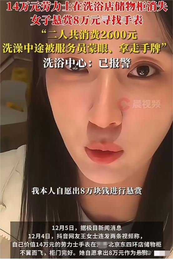 12月1日,北京,女子游玩期间,花2640元去洗浴中心放松,洗澡期间店员将她的眼睛盖住拿走了她的手牌,结束后女子发现储物柜里价值140000元的劳力士不见了,奇怪的是柜门完好无损,根本没有撬动的痕迹。因手表意义非凡,女子悬赏8万寻找线索。   “不蒸馒头争口气,我愿意出8万悬赏,只要能抓到这个人!”这句带着愤怒与执着的表态,迅速引起公众的关注。   一起发生在北京东四环洗浴中心的离奇失窃案,也因此走进了人们的视野。价值十四万元的劳力士手表,在一个看似安全的储物柜里消失得无影无踪,而柜门却完好无损,诸多反常的细节,这场失窃案充满了疑点。   12月1日,王女士来到一家高档洗浴中心放松,支付2640元后,她像其他顾客一样,将随身物品锁进了储物柜,手牌紧紧套在手腕上。   随后,一切都按照标准流程进行:搓澡、洗头,服务员还贴心的为她戴上眼罩,说是为了让她更好地放松。然而,在眼睛被遮住的那段时间里,王女士感觉到手腕上的手牌被轻轻取下又戴回。当时她并未多想,以为这只是服务的一部分。   一小时后,当她重返储物柜,打开那个毫无损坏痕迹的柜门时,手表已经不翼而飞。那一刻的震惊与无助,难以用语言形容。   由于该手表是王女士的生日礼物,承载着亲人的祝福与牵挂,而且金额高达14万,所以警方已经立案调查。   可让王女士感到不安的是,她在抖音发布悬赏视频后,不少网友在评论区留言,称自己之前去这家店消费时,也遇到过服务员长时间拿走手牌的情况。这个信息让大家不得不怀疑,该店的服务流程是否存在刻意为之的漏洞。   12月4日,王女士又发布了一条价值8万元的高额悬赏,征集有效线索。不过截至目前,案件仍在进一步侦办中,警方还没有披露更多调查进展,手表的下落依然是个谜。   面对外界的质疑和关注,涉事的洗浴中心在12月5日作出了回应,表示会配合警方调查。但对于大家最为关心的核心问题:服务员为何要拿走手牌、店内监控是否存在盲区、日常是否有规范的手牌管理流程等,店方并没有给出具体解释。   这种模糊其辞的回应,不仅没能打消公众的疑虑,反而让更多人对该店的安全管理产生了质疑。   期待这起案件早日水落石出,给王女士一个交代,也给所有关注此事的人一个真相。对此你有什么看法?欢迎在评论区留言讨论。洗浴中心财物存放于安全   信息来源: 潇湘晨报2025-12-5|女子称洗浴时14万元劳力士表从储物柜消失,悬赏8万寻找,警方已介入 文|墨海 编辑|史叔