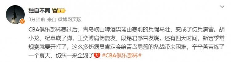 青岛四将受伤输给山东,广东广州都有伤病员,俱乐部杯太惹是生非 青岛队胡小龙和纪卓崴脚,段昂君发烧,王奕博肩伤复发,其实广东、广州和江苏,在俱乐部杯比赛时候,也是至少三将不能打球,尤其广东队外援麦考尔,今天走路都一瘸一拐,崴脚居然如此严重,距离CBA揭幕战不远,俱乐部杯变成打人比赛,各队主教练都想不到吧? 很多青岛球迷骂裁判,事实上缺病少将的青岛队,只能让省队捡便宜,由于俱乐部杯临近CBA揭幕战,各队都想趁机磨合队伍,在裁判放纵恶犯的情形下,很多球员事实上就是暴力打人伤人,那么这样的比赛,还真的不如放弃。