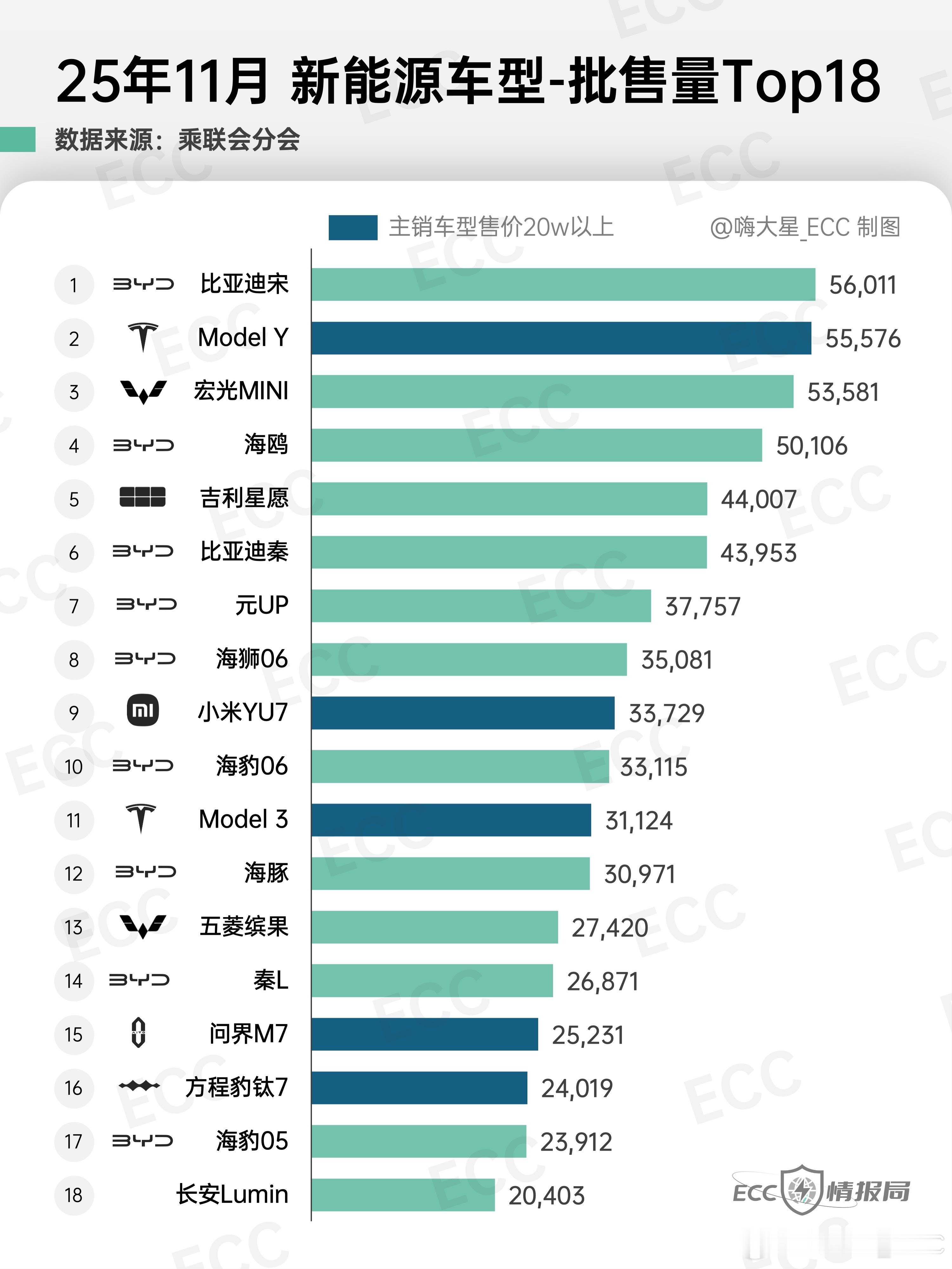 11月新能源车型销量——几款重点车型:- Model Y:55,576- 小米 YU7:33,729- Model 3:31,124- 问界M7:25,231- 方程豹 钛7:24,019数据来源:乘联会ecc情报局ecc小纸条