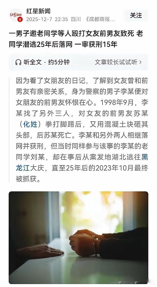 这起发生在湖北宜昌的案件,是一起因情感纠纷和极端报复心理引发的严重暴力犯罪,最终导致了一人死亡的悲剧。 起因:一名男子在偷看了女朋友的日记后,发现她曾与前男友有过性关系,由此心生怨恨和报复念头。 该男子邀请了三名同学,共同将其女朋友的前男友约出并进行殴打。 被害人在殴打中不幸死亡。案发后,主犯(即该男子)和两名同伙很快被抓获,并被依法判处刑罚。然而,第四名犯罪嫌疑人却畏罪潜逃,长达数年。 近日,在警方的不懈追捕下,这名潜逃多年的最后一名犯罪嫌疑人终于被成功抓获,并将面临法律的严惩。 这四名男子的行为已构成严重的刑事犯罪,具体罪名很可能是故意伤害罪(致人死亡) 或故意杀人罪。 - 故意伤害罪(致人死亡):这是指行为人明知自己的行为会造成他人身体伤害,并且希望或者放任这种结果发生,最终导致被害人死亡的情形。在这起案件中,如果四名男子的初衷只是想“教训”一下被害人,而不是要致其于死地,但他们的殴打行为却直接导致了被害人的死亡,那么他们就构成了此罪。 - 故意杀人罪:这是指行为人明知自己的行为会导致他人死亡,并且希望或者放任这种结果发生。如果有证据表明,四名男子在殴打过程中使用了足以致命的手段,并且主观上对被害人的死亡持放任甚至希望的态度,那么他们就可能被认定为此罪。 无论是哪种罪名,致人死亡都是极其严重的犯罪情节,根据《中华人民共和国刑法》,都将面临严厉的刑罚,最高可判处死刑。 社会反思 这起悲剧给我们带来了深刻的教训: 情感处理需理性:在面对情感挫折和背叛时,采取极端暴力的方式进行报复是不可取的,这不仅会毁掉别人的生命,也会让自己和家人付出沉重的法律和人生代价。遇到问题应保持冷静,通过合法、理智的途径解决。 尊重他人隐私:偷看他人日记是一种侵犯个人隐私权的行为,也是对他人人格的不尊重。这种行为往往是引发矛盾和冲突的导火索。 交友需谨慎:三名同学为了所谓的“哥们义气”,便参与到如此严重的暴力犯罪中,最终同样锒铛入狱,毁掉了自己的前途。这警示我们,在朋友需要帮助时,应分清是非对错,不能盲目附和,更不能参与违法犯罪活动。 法网恢恢,疏而不漏:犯罪嫌疑人妄图通过潜逃来逃避法律制裁,但最终还是被抓获。这充分说明情侣被杀案 家庭暴力的案子 情感凶杀案 湖北伤人事件 素材来源于网络,侵权删除。