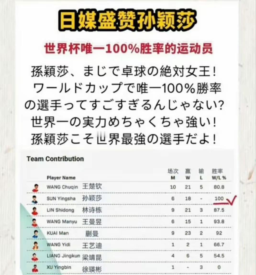 莎莎是绝对的世界第一。 混团比赛,莎莎百分百胜率,何人能及?只要上场就是100分,日媒不得不盛赞她的完美表现。 大头、小石头和蒯曼是劳模典范,三个人扛下来半壁江山。 曼昱绝对是优等生,93.8%的胜率同样令人恐怖。 王艺迪出场一次,正常表现。 梁靖崑胜6负5,和他的第三人身份相比表现不够好。 徐瑛彬上场一次,毫无建树,输得莫名其妙,相当失望。