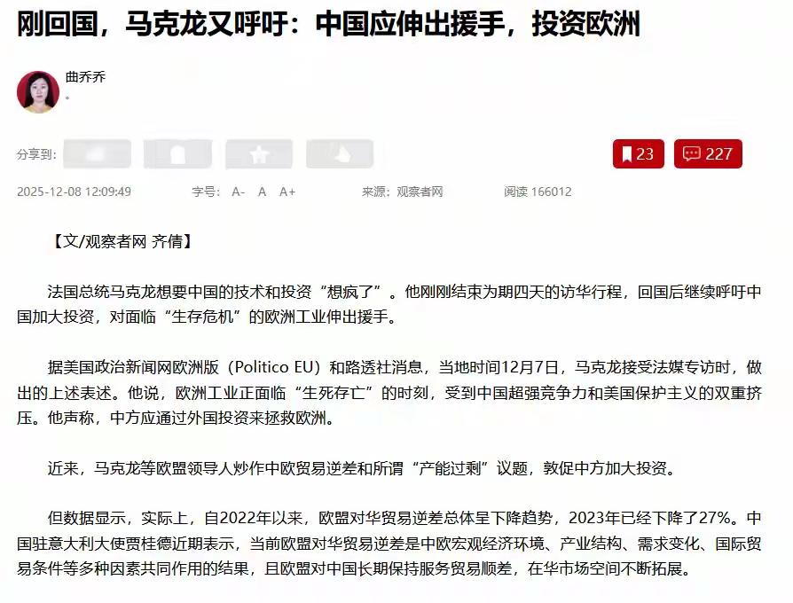 “变脸王”。2025年12月3日至5日,马克龙完成第四次对华国事访问,不仅在社交平台用中文致谢“中国如此热情的接待” ,还与中方签署核能、农食等多领域合作文件 ,可归国仅两日就画风突变,堪称国际外交舞台的“变脸王”。 这位刚在中国体验超规格礼遇的总统,转头就在《回声报》采访中撂下狠话:“若中方不解决贸易顺差,欧洲将效仿美国对华加征关税”,还呼吁中国像过去欧盟投资中国那样“拯救欧洲工业”。这论调着实荒诞,要知道2024年欧盟对华服务贸易仍保持503.58亿美元顺差,早年欧洲企业来华是奔着赚得盆满钵满,而非“拯救”,如今却想让中国单向让利,双标属性拉满。 从访华时的“战略伙伴”表态,到归国后的关税威胁,马克龙的变脸实则有深层算计:一方面是国内制造业外移的焦虑,另一方面是争夺欧盟对华经贸话语权。但他显然打错了算盘,欧盟贸易政策需27国一致同意,德国等国已释放对华务实合作信号,其单边施压不过是政治表演。毕竟中国的发展从不是谁的施舍,合作的大门虽敞开,但想靠“变脸”换利益,注定只能是空谈。