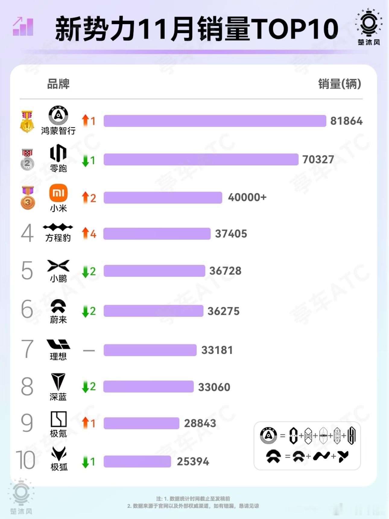新势力11月销量top十。真是后来者居上啊,鸿蒙智行第一,零跑第二,小米第三。蔚小理3w+,再一次来到了同一起跑线。极狐真是顽强啊,打不死的小强,虽然声量不大,但是各种榜单总能见到身影。