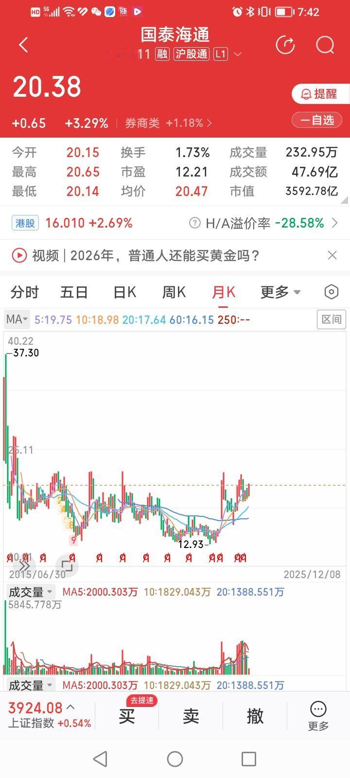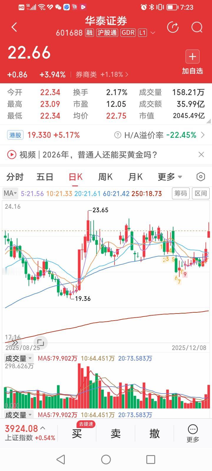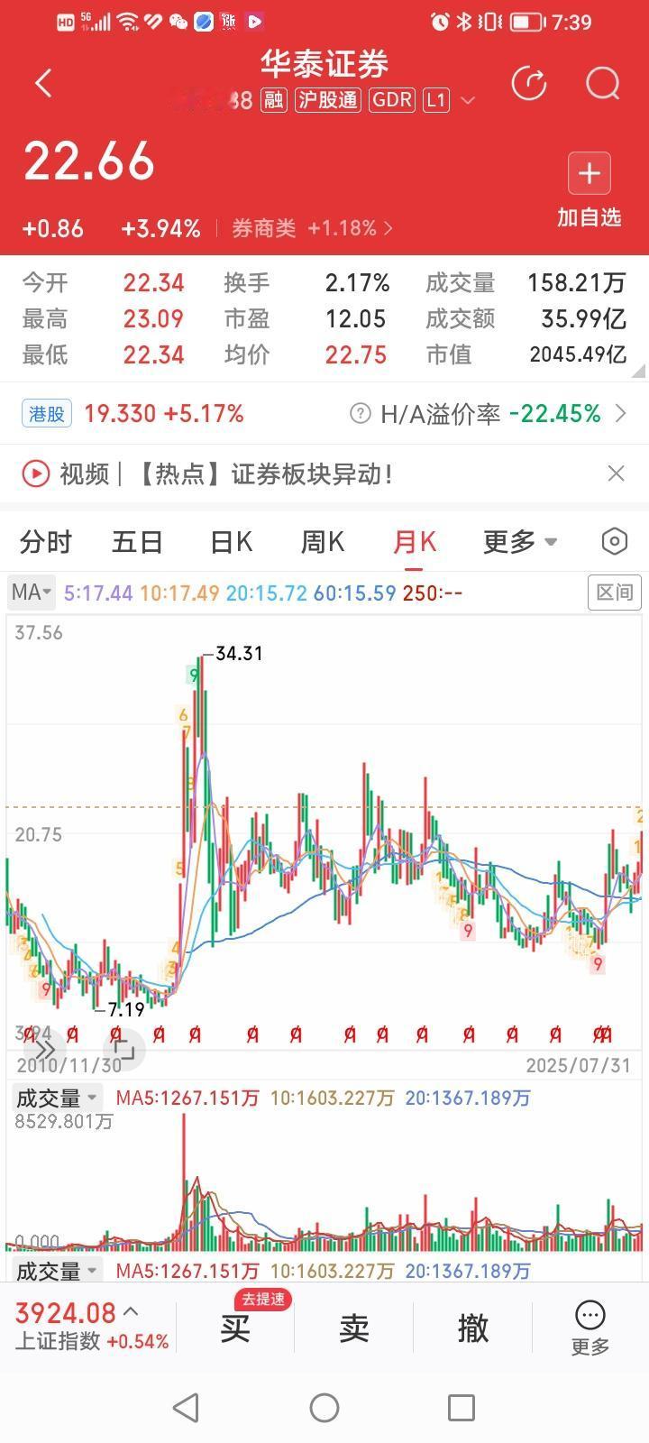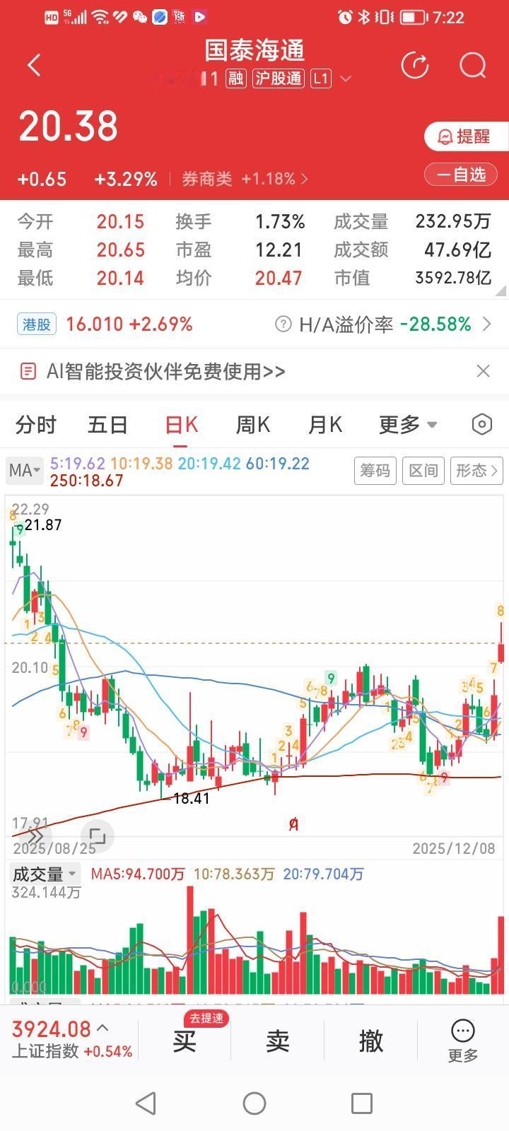 国泰和华泰,哪个是咱该吃的菜?国泰海通和华泰证券这几天股价强势上涨,你追我赶,这泰哥俩好像有点较劲的意思。 从估值角度看,华泰证券最新动态市盈率12.05倍,国泰海通最新动态市盈率12.22倍,似乎华泰证券更低估。 从K线形态看,华泰证券上升通道角度更优雅,更强悍,而国泰海通回撤较大,近期已经两度回撤考验年线支撑了。 从牛股基因看,历史上国泰海通股价上涨高度有限,波动幅度不大,国泰海通股价的冲劲似乎总是稍显不足。 综上,华泰证券似乎更有冲劲。更有后劲。