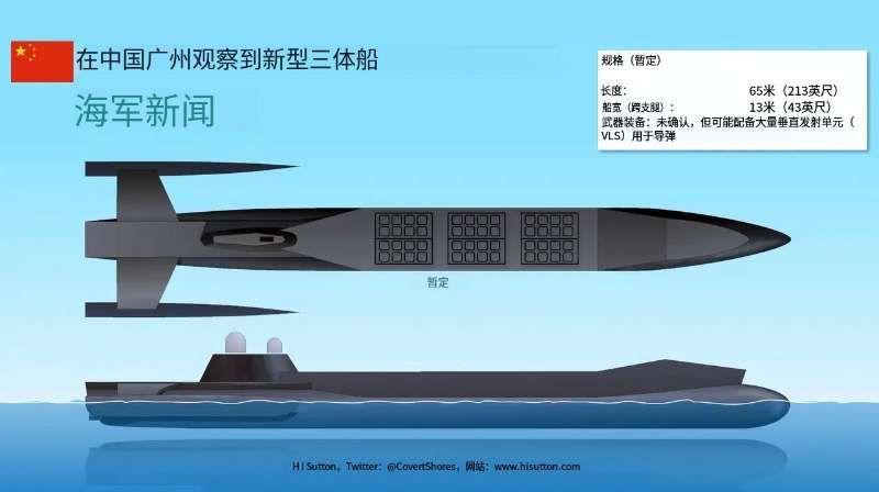 外媒吃瓜围观的图,AI说它可能是“半潜舰”。具体有啥用途呢,根据网上一些博主和AI的分析汇总来看,这条黑不溜秋的“大鱼”可不简单,江湖人称武库舰,又名“移动弹药库”。 据说它可以搭载大量导弹执行对海、对陆打击任务,分担主力舰艇火力。换而言之,就是它可以跟在其他水面主力舰艇编队周围,必要时突然钻出水面,嗖,嗖,嗖,地发射导弹为水面舰艇提供火力支援。 更厉害的是,据猜测它还可能具备无人机起降能力,可以作为无人作战系统母舰来使用。 从外表看,它的船体设计采用三体结构(主船体+两侧副船体),上层建筑低矮、紧凑,意味着可能采用无人或少人操控技术,这很符合未来智能化海战发展方向。 这种三体结构优势可不少: 1.高速航行时兴波阻力小,航速较高。 2.主甲板宽,适航性和搭载空间大,可在5级海况下起降无人机、直升机,6级海况下使用武器。 3.有利于快速部署特种部队或执行水下探测任务。 4.可部分浸没水中,雷达反射面积比普通驱逐舰小90%以上;上浮后能以高速机动,兼顾隐蔽与机动性。 总而言之它的动力与隐身很牛掰,据推测可能采用泵喷推进系统,高速航行时噪音接近海洋本底,具备“悄无声息接近+快速撤离”的作战能力。 前甲板疑似配备48单元垂直发射系统(VLS),可搭载巡航导弹等武器,火力密度接近052C型驱逐舰水平。 又一员猛将加入太好了,给它点个赞吧[赞]!