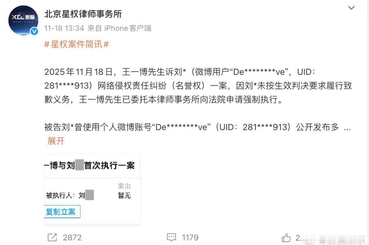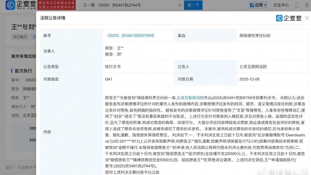 王一博申请强执侵权# #侵权王一博黑粉被判赔2.5万# 2025年12月08日。北京互联网法院作出(2025)京0491民初6759号民事判决书。被告刘某发布的涉案微博评论,针对原告使用了“文盲”等侮辱性、人身攻击性侮辱词汇;使用了“封杀”“进去了”等没有事实依据的不当陈述。上述行为系对原告的人格贬损,涉及对原告人格、品德的否定性评价,丑化了原告的形象,构成对原告的侮辱,诽谤等行为。大部分评论均获较高点赞数,势必造成对原告的名誉权的侵犯,应当承担停止侵害、赔礼道歉、赔偿经济损失等侵权责任。判决如下……被告刘某,向原告赔礼道歉,致歉声明需保留72小时,赔偿原告王某经济损失20000元,精神损失抚慰金5000元……王某申请强制执行{案号:(2025)京0491执2744号}执号,现对上述判决主要内容予以公告。