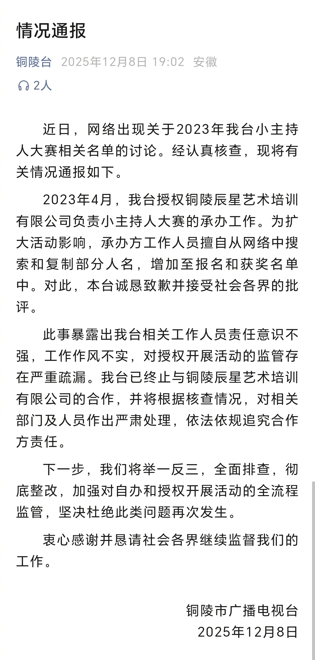 【铜陵市广播电视台情况通报】近日,网络出现关于2023年我台小主持人大赛相关名单的讨论。经认真核查,现将有关情况通报如下。2023年4月,我台授权铜陵辰星艺术培训有限公司负责小主持人大赛的承办工作。为扩大活动影响,承办方工作人员擅自从网络中搜索和复制部分人名,增加至报名和获奖名单中。对此,本台诚恳致歉并接受社会各界的批评。此事暴露出我台相关工作人员责任意识不强,工作作风不实,对授权开展活动的监管存在严重疏漏。我台已终止与铜陵辰星艺术培训有限公司的合作,并将根据核查情况,对相关部门及人员作出严肃处理,依法依规追究合作方责任。下一步,我们将举一反三,全面排查,彻底整改,加强对自办和授权开展活动的全流程监管,坚决杜绝此类问题再次发生。衷心感谢并恳请社会各界继续监督我们的工作。铜陵市广播电视台2025年12月8日