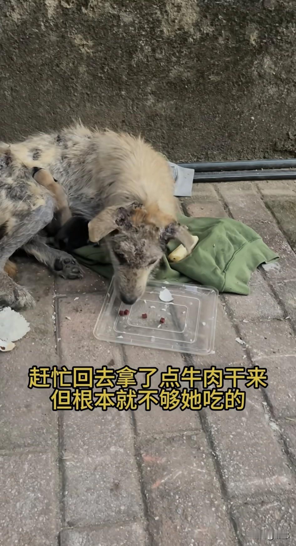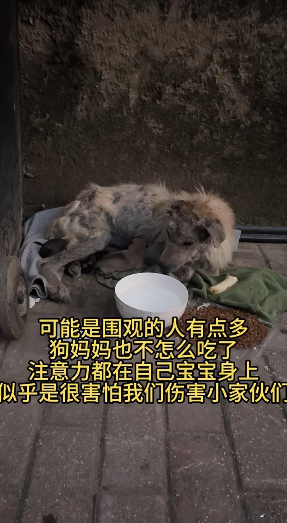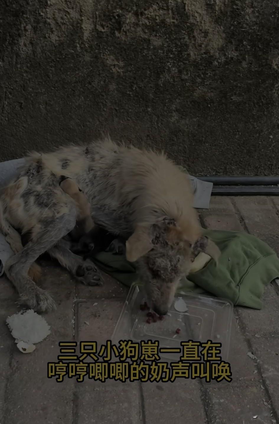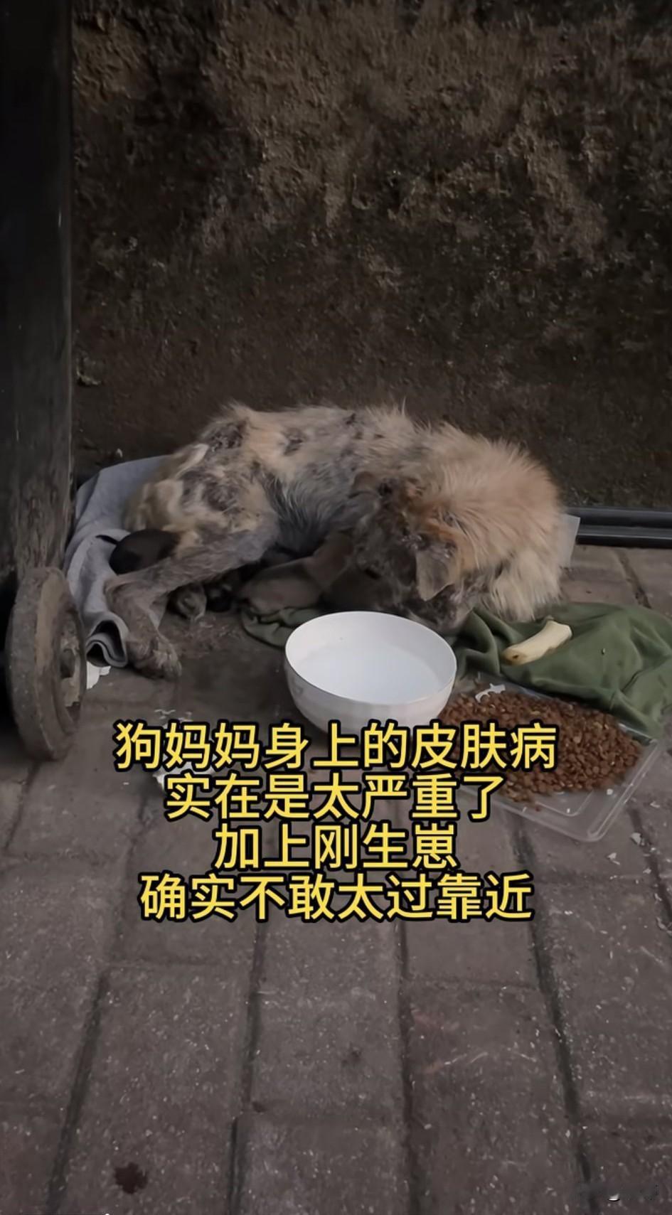 太可怜了!这天一位小姐姐下楼倒垃圾的时候看到一只得了严重皮肤病得狗妈妈蜷缩在垃圾桶旁边,还有几只出生没多久的狗宝宝,狗妈妈身上的皮肤病实在太严重了,小姐姐也不太敢靠近,不过她很同情狗狗,于是赶紧回去拿了点牛肉干来,但根本不够它吃的。 于是她又跑去买了一袋狗粮给它倒了满满一堆,开始的时候,狗妈妈吃的很开心,可估计是围观的人有点多了,狗妈妈也不怎么吃了,注意力都在自己的宝宝身上,似乎害怕我们伤害小家伙们。 可它这状态怎么能熬的过这个寒冷的冬天,更不要说那些狗宝宝了,善良的小姐姐顿时心生怜悯,于是决定救助这几只可怜的狗狗,她联系了宠物医院,让他们派人把狗狗一家接去了医院治疗,在住院期间小姐姐也经常去看望它们,后来它们出院小姐姐就把它们带回去收养了,相信在小姐姐家,它们也会过上幸福快乐的生活。