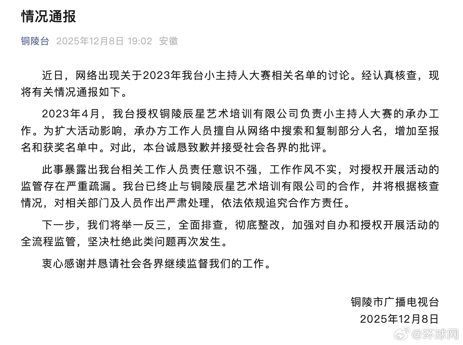 #铜陵市广播电视台道歉#【安徽铜陵广播电视台通报“小主持人大赛相关名单”问题:为扩大活动影响,承办方工作人员擅自从网络中搜索和复制部分人名,增加至报名和获奖名单中】#电视台通报小主持人大赛名单问题#↓↓