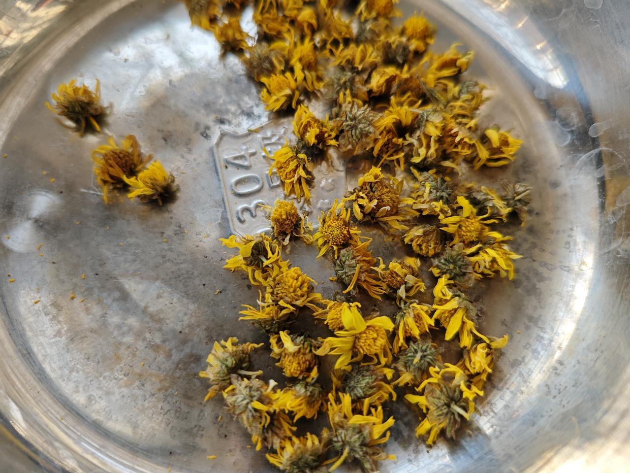 你们喝过正宗的野菊花茶吗? 徒步爬山,见到山顶上有不少的野菊花,想摘点泡菊花茶。怕判断不准,还特意找AI问了一下,回复可以食用,摘了一点,刚好够一壶。 知道没问题后,我还吃了一朵新鲜的,凉凉的,有点薄荷的感觉,浓郁的菊花味道,直冲天灵盖,心想,这回算是找到好东西了。 回到家后,把菊花放在省碟里,一天就干透了,先放了5朵泡了一杯试喝,还加了点冰糖。开水一冲,茶是热的,喉咙是凉丝丝的,跟盒装的菊花茶没得比,突然感觉,后悔摘少了。 此时正是野菊花盛开的季节,这种野货数量稀缺,碰上就摘点,晒干又是一壶好茶。 野菊花 菊花茶 爬山 山货