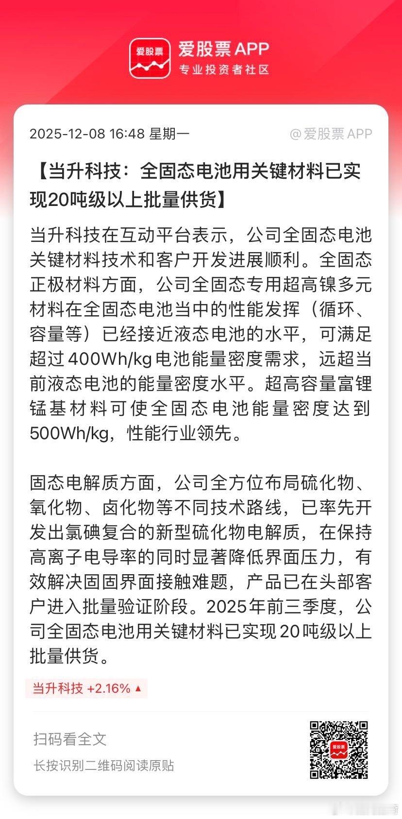 【当升科技:全固态电池用关键材料已实现20吨级以上批量供货】当升科技在互动平台表示,公司全固态电池关键材料技术和客户开发进展顺利。全固态正极材料方面,公司全固态专用超高镍多元材料在全固态电池当中的性能发挥(循环、容量等)已经接近液态电池的水平,可满足超过400Wh/kg电池能量密度需求,远超当前液态电池的能量密度水平。超高容量富锂锰基材料可使全固态电池能量密... 网页链接