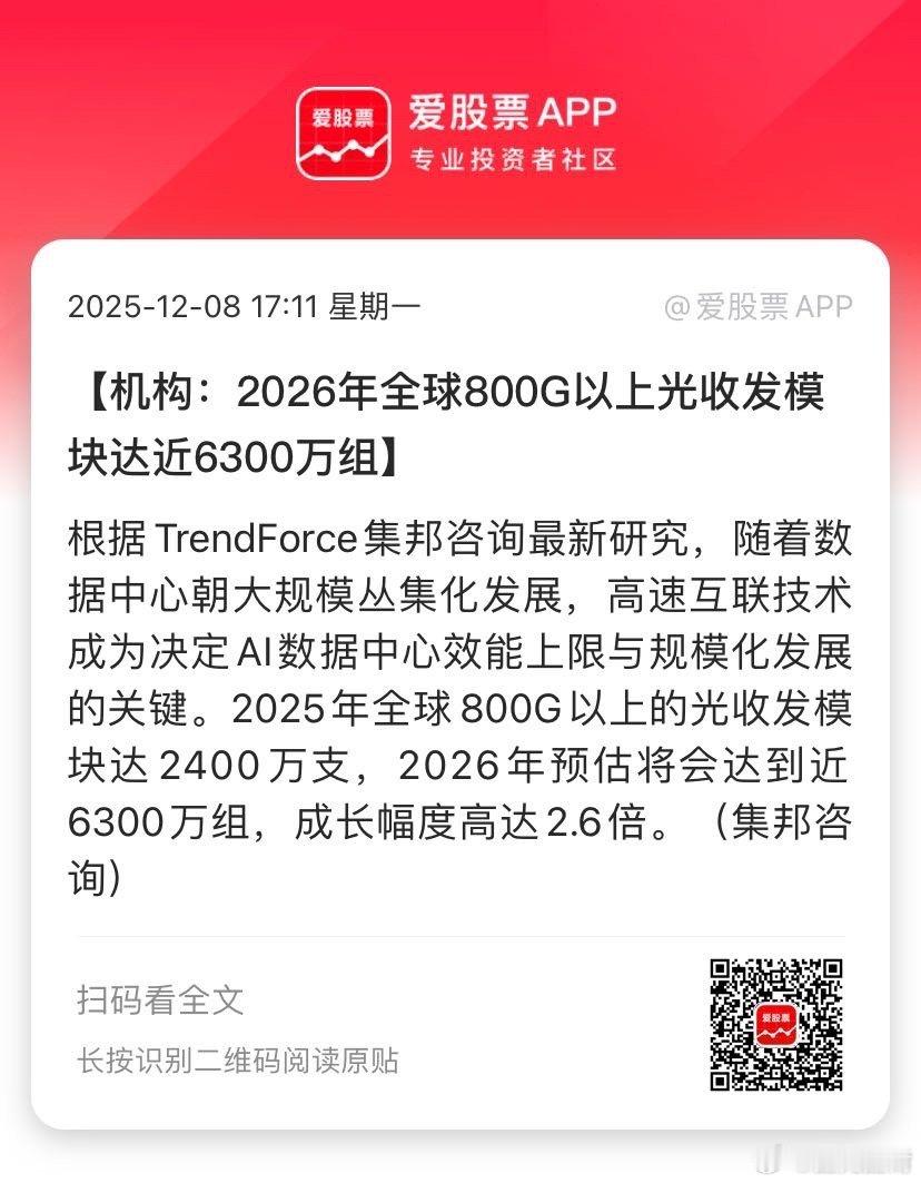 【机构:2026年全球800G以上光收发模块达近6300万组】根据TrendForce集邦咨询最新研究,随着数据中心朝大规模丛集化发展,高速互联技术成为决定AI数据中心效能上限与规模化发展的关键。2025年全球800G以上的光收发模块达2400万支,2026年预估将会达到近6300万组,成长幅度高达2.6倍。(集邦咨询)... 网页链接