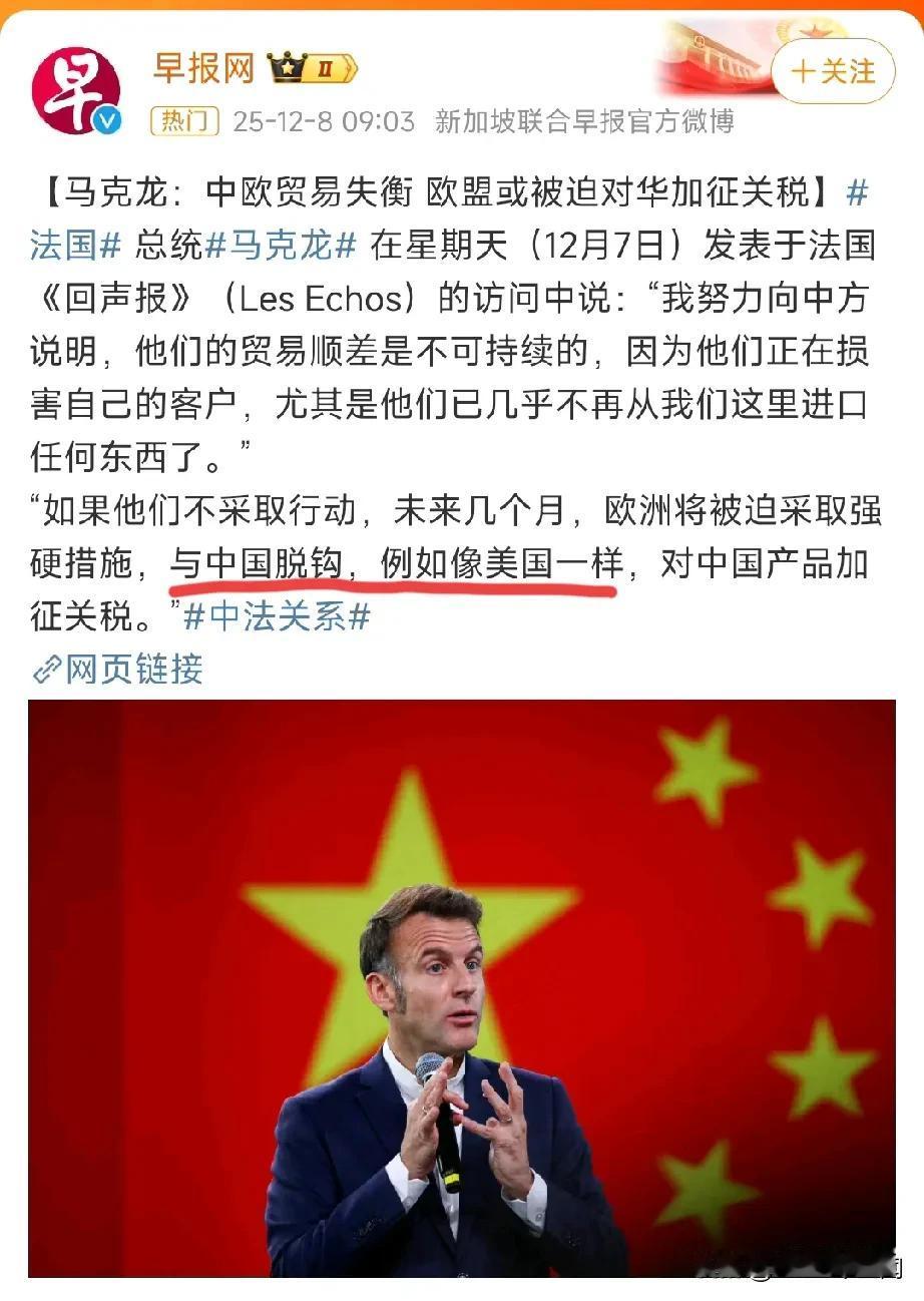 看看新加坡媒体有多恨中国! 同样是解读马克龙对华加税: 新加坡媒体说,马克龙不仅要对华加税,还要像美国那样和中国“脱钩”…… (言外之意,新加坡盼着欧洲马上和中国脱钩,好看笑话) 而俄罗斯媒体说,马克龙将“采取强硬措施,例如对中国产品加税”…… (实事求是地解读了马克龙的对华加税政策取向)