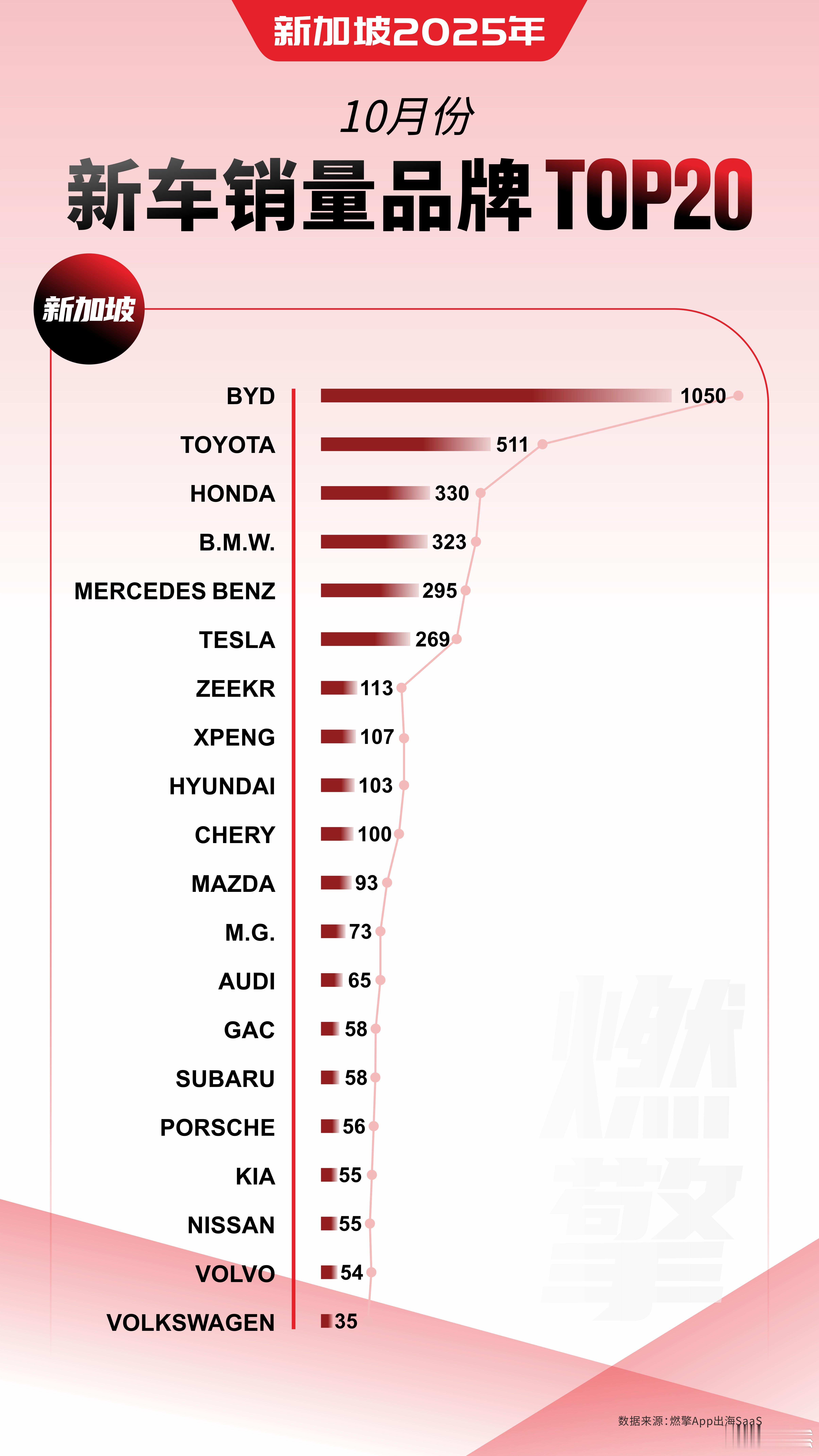 新加坡新车市场:比亚迪断层式领先10月,新加坡新车市场呈现出以新能源和性价比为导向的鲜明格局。比亚迪凭借对本地需求的精准把握显著领先,多个中国品牌集体进入榜单,而传统豪华及日系品牌的市场份额则面临收缩压力。比亚迪以1050辆的月销量位居榜首,达到第二名丰田的两倍。其成功关键在于产品与新加坡城市用车场景的高度契合:海豚、元PLUS等小型及紧凑型电动车,在适应狭窄道路与停车条件的同时,提供了满足日常通勤的续航能力。配合完备的配置与更具竞争力的价格,精准回应了当地消费者注重实用价值、而非单纯品牌溢价的购车心理。传统品牌方面,丰田与本田分别凭借511辆和330辆的销量,依靠燃油及混动车型长期积累的可靠性口碑,维持着部分家庭用户的基本盘。宝马、奔驰等豪华品牌则主要服务于高端细分市场。然而,这些品牌的销量规模均已明显落后于比亚迪,反映出新加坡市场的消费重心正从依赖传统品牌惯性,转向青睐更贴合实际使用的新能源车型。特斯拉本月以269辆的销量位列第六,其品牌溢价在新加坡这一注重实用性的市场中并未形成足够竞争力。与此同时,极氪、小鹏、奇瑞、MG等中国品牌集体进入榜单,形成了差异化的市场布局:极氪以设计和配置吸引中高端用户;小鹏凭借智能驾驶功能主打科技属性;奇瑞与MG则以高性价比覆盖预算有限的通勤群体。这种多梯队、全场景的产品策略,显著提升了中国品牌在新加坡市场的整体能见度。未来,比亚迪的领先地位预计将持续巩固,若能在充电适配等本地化服务上进一步优化,其市场份额有望继续扩大。其他中国品牌如能深化售后网络等本土运营,也将对传统品牌份额形成持续分流。而对于特斯拉及传统豪华品牌而言,若不能推出更贴合新加坡城市通勤场景、价格更具竞争力的实用车型,其市场份额可能面临进一步收缩的压力。大v聊车