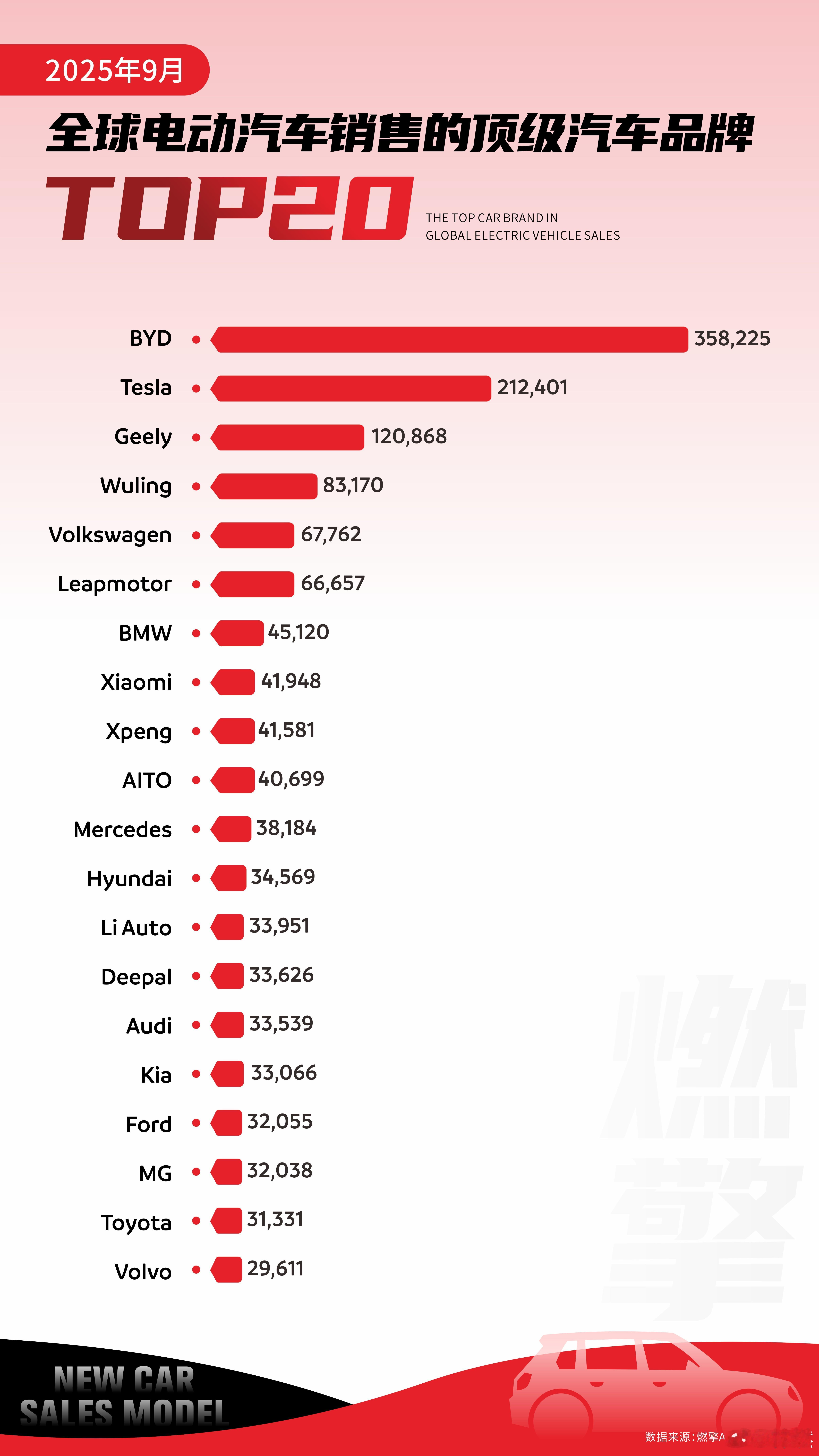 9月,全球电动汽车品牌销量榜:比亚迪一级绝尘,特斯拉穷追不舍9月,全球电动汽车品牌销量格局呈现出清晰的竞争态势。比亚迪凭借显著优势保持领先,中国品牌整体表现强势并占据主导地位,而传统及日韩品牌的电动化转型则相对滞后,市场已呈现主流与细分市场分化的特点。比亚迪以358225辆的月销量位居榜首,达到特斯拉销量的1.7倍。其成功得益于覆盖全价位和全场景的产品布局:从满足日常通勤的海鸥、海豚系列,到主打家庭用户的宋、秦系列,再到定位中高端的海豹、汉系列,全面契合了全球市场对电动车的多样化需求。中国品牌整体表现强劲,在销量前二十名中占据近六成席位,形成了清晰的竞争梯队。以吉利和五菱为代表的第一梯队,分别以120868辆和83170辆的销量,通过高性价比的入门级车型巩固了大众市场基础。由零跑、小米、小鹏、AITO、深蓝、MG等品牌组成的第二梯队,则凭借智能化与年轻化的产品定位,在中端市场获得消费者认可。这种多层次、广覆盖的产品策略,是中国品牌在全球市场占据主导地位的核心支撑。特斯拉以212401辆的销量位列第二,其品牌影响力依然显著。然而,仅依赖Model Y和Model 3两款主力车型的产品策略,使其在满足更广泛消费场景方面面临挑战,与领先品牌的差距有所扩大。相比之下,传统及日韩品牌的电动化进程显得较为缓慢。传统品牌中,大众以67762辆的销量成为唯一进入前五的非中非特斯拉品牌,但整体表现已落后于多数中国品牌。福特、沃尔沃等品牌的销量排名靠后,反映出其在电动化转型中的产品竞争力有待提升。日韩品牌方面,现代、起亚、丰田的电动车型销量均在3万辆级别徘徊,显示出其电动产品布局和市场适应性尚存不足。豪华品牌如宝马、奔驰、奥迪则主要固守高端细分市场,难以撼动中国品牌在大众消费市场的主导地位。未来,比亚迪的领先优势预计将继续保持,中国品牌的集体竞争力有望进一步强化市场份额。特斯拉若不能拓展更丰富的产品线以覆盖更广泛的价格区间,可能面临市场空间被持续挤压的局面。对于传统及日韩品牌而言,加速电动车型的本地化适配与技术迭代,将是重新赢得主流市场竞争力的关键。整体而言,全球电动汽车市场正朝着由中国品牌主导大众市场、其他品牌深耕细分领域的方向持续演进。大v聊车