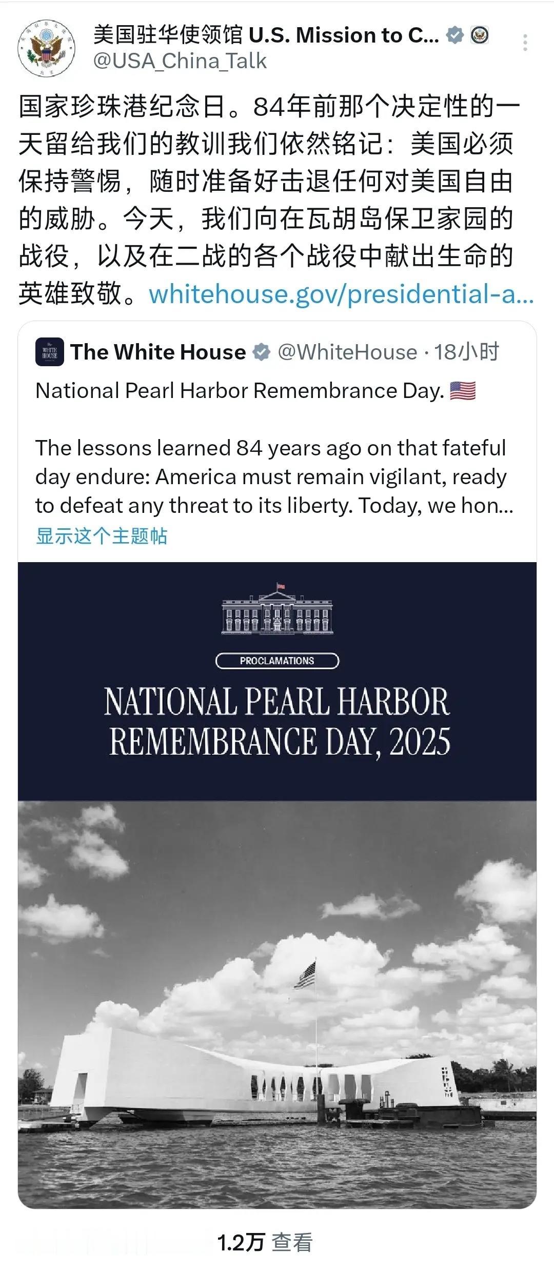 还未释怀? 美国驻华使领馆在其官网发文,国家珍珠港纪念日。84年前那个决定性的一天留给我们的教训我们依然铭记:美国必须保持警惕,随时准备好击退任何对美国自由的威胁。今天,我们向在瓦胡岛保卫家园的战役,以及在二战的各个战役中献出生命的英雄致敬。 日本靖国神社里供奉着众多参与偷袭珍珠港的日本军人的牌位。美国始终没有忘记究竟是谁偷袭了珍珠港;日本同样也没忘记究竟是谁投下了那两颗让自己遭受重创的原子弹!然而,双方都绝口不提对方的名字,这真可谓是“父子情深”? 珍珠港袭击事件 珍珠港大反转 珍珠港计划 珍珠港爆炸案 美国驻华大使馆 哪个国家偷袭了美国珍珠港
