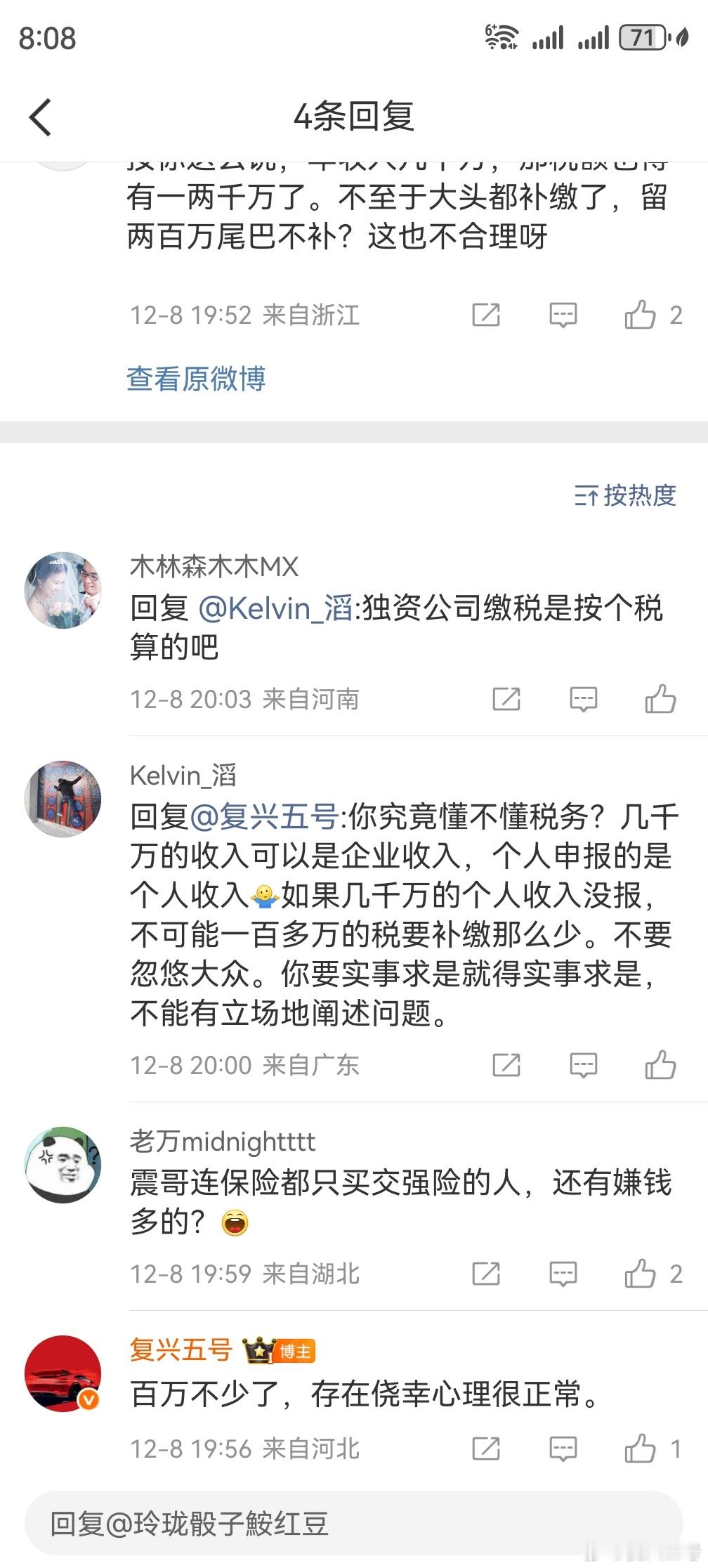 又有网友说了,陈震每年几千万是公司收入,个人不见得有这么多,央视报道里提到的天津公司,企业类型属于个体工商户,其经营所得直接归属于业主个人,适用个人所得税的征税规则。 并且请仔细审题图四,仅广告收入两千多万,每年申报综合所得仅一百多万,已经点明了,查他的原因是每年交这点税,天天广告接的飞起,炫富,开豪车,高消费,人家税务觉得申报税额与他实际消费能力和收入不符,看不明白吗?没有一点冤枉他的地方。