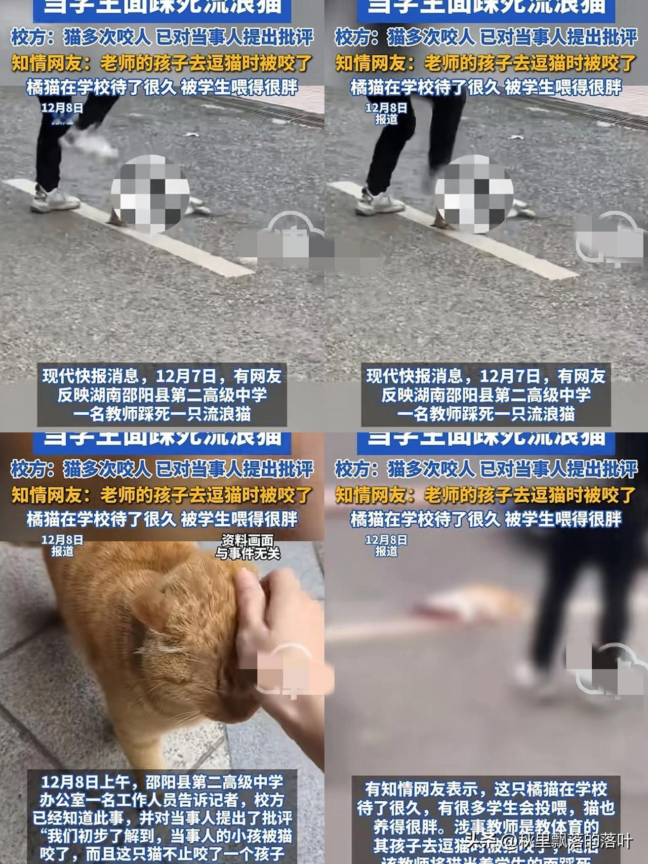 没有经历过的人, 真的不知道湖南流浪猫被踩死当时有多么绝望! 先说说我本人的真实感受,我是个怕小动物的人,不管多么小,多么可爱的小动物,我都害怕它会咬我或者挠伤我。 可我至少不会上前去欺负它,从前看到一堆小朋友合起伙来拿着砖头去砸一只小猫,我还上前制止。 在小猫的眼里,我们就和巨人一样,或许它的内心肯定更加不安吧! 湖南流浪猫伤人,学生踩死猫这件事,校方却说猫多次咬人,老师的孩子去逗猫被咬了。 我有个疑问,这只橘猫在学校很久很久了,被学生喂的胖乎乎的,如果性情不稳定会暴起伤人,试问有哪个人会去喂养?更别说白白胖胖的了,保安肯定第一个站出来不同意。 我虽然怕小动物,但我觉得猫这种动物,你不惹它,它肯定不会暴起伤人,更何况还是学校待了很久的猫。你觉得呢?