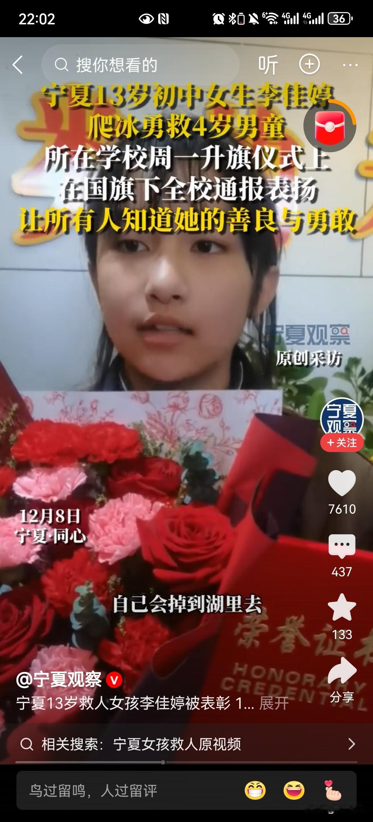 从小就对消防员特别崇拜的宁夏13岁女孩李佳婷因为奋不顾身救四岁的小弟弟,近日获得了各种表彰和奖励,但是我觉得最应该给这个孩子的奖励是获得当地最好高中的免试直通资格,让这种内心善良的孩子站在更高的起点上,有一个更美好的未来。 这个孩子是那种“人之初,性本善”的孩子,好多东西根本不是家长叫出来的,真的是骨子里的善良驱使她去做这件事。