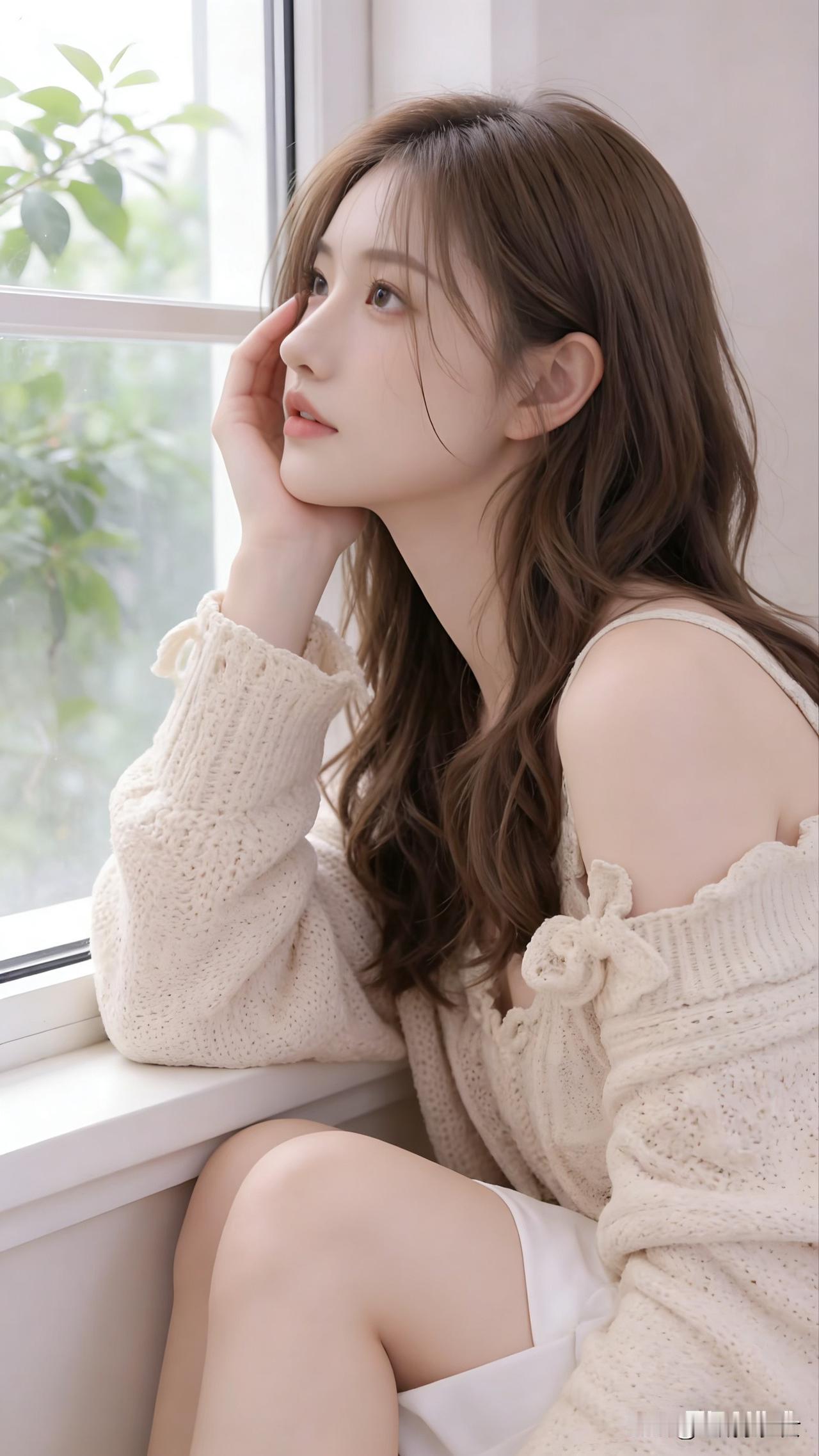 白衣少女坐窗边,电话响声入耳旁。白t恤女孩