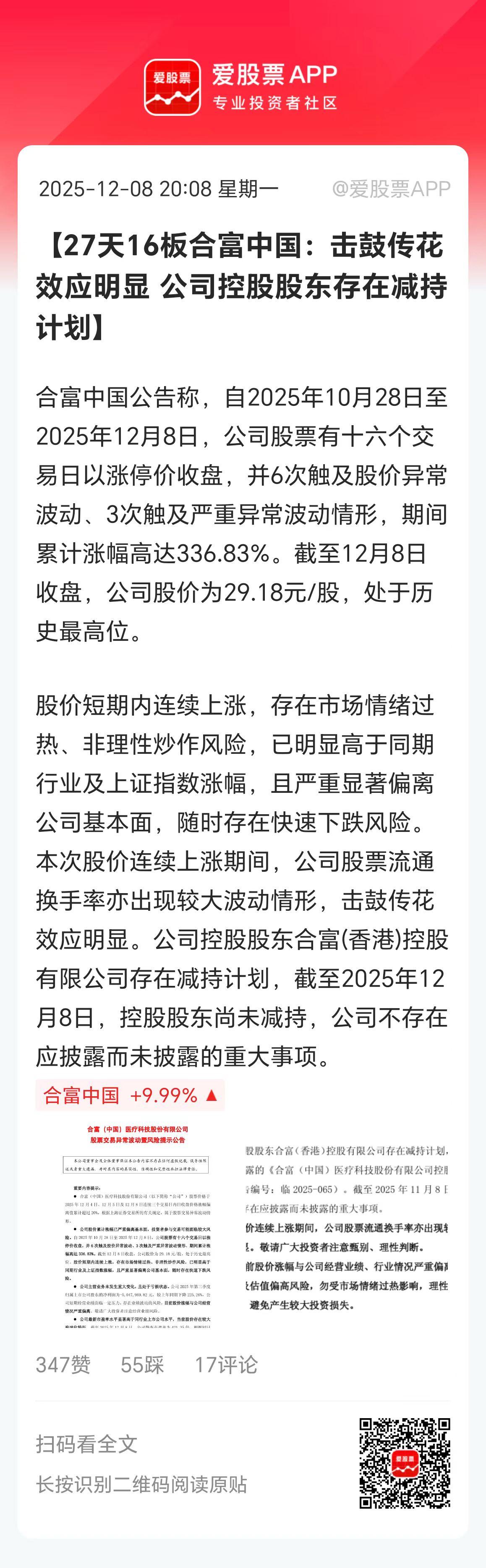 合富中国1个多月从6块涨到29块,接近4倍的涨幅,股价也创了历史新高! 公司出来提示炒作风险,一是击鼓传花,二是随时存在快速下跌风险,三是大股东随时准备减持。这个大股东真耐得住性子啊,竟然还没开始减持。 这一波福建炒地图,确实强的一批。这个多数肯定是瞎炒,但也能理解吧!这个题材太特殊了,A股散户千千万万,不缺接盘的资金。所以你把它当投机就好了,涨的时候不用管太多,到时候崩了也不要怪谁。