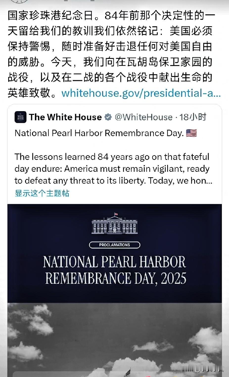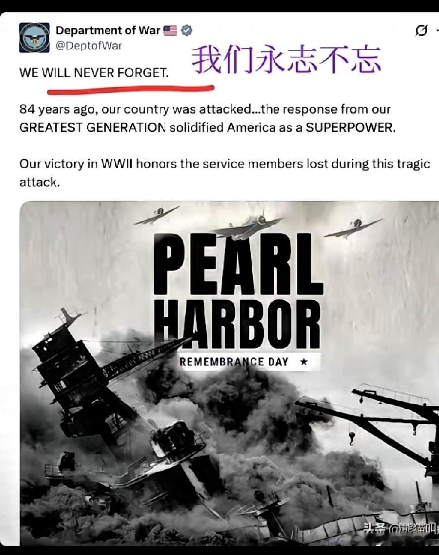 美,日两国同一天纪念《珍珠港事件》中牺牲军人,这一刻的本性暴露 12月7日,一个被历史刻入双重记忆的日子。五角大楼的纪念海报上,“我们永志不忘”的字样凝重如铁,84年前珍珠港的硝烟虽已散尽,美军将士的鲜血却永远凝固在美利坚的集体记忆中。那场突如其来的袭击,让美国卷入二战漩涡,而“最伟大的一代人”的绝地反击,最终铸就了超级大国的根基——这份纪念,是对牺牲者的告慰,更是对历史正义的坚守。 然而,在地球的另一端,日本群马县前桥市的岩佐家,一场诡异的追悼会正在同步上演。县议员、市议员、商界人士与高中生齐聚一堂,悼念的对象竟是偷袭珍珠港的旧日本海军军官岩佐直治。当美国为捍卫主权的牺牲者默哀时,日本却在为侵略战争的参与者招魂,两个国家对同一历史事件的认知,呈现出令人窒息的割裂。 这不是简单的立场差异,而是历史正义与军国主义余孽的直接对峙。珍珠港事件中,日军的偷袭造成数千名美军丧生,无数家庭破碎,这份伤痛早已刻进美国的民族记忆;而对包括中国在内的亚洲受害国而言,日本军国主义发动的侵略战争,更是带来了长达十余年的生灵涂炭,数千万人死于战火,无数文明成果毁于一旦。如今,日本部分势力对战争罪犯的缅怀,本质上是对历史正义的亵渎,是对受害国人民情感的公然践踏。 最荒诞的是,这两个在历史上有着血海深仇的国家,如今却以“盟友”相称。当五角大楼的纪念海报与岩佐家的追悼仪式在同一天出现,所谓的“盟友关系”便显得格外讽刺。仇恨的种子从未真正根除,只是被地缘政治的利益算计暂时掩盖。一个不愿正视历史、甚至为侵略行为招魂的国家,与一个铭记牺牲、坚守正义的国家,骨子里的对立从未消解,所谓“盟友”不过是权宜之计的表面文章。 历史是最好的镜子。12月7日的双重纪念,照见的不仅是两个国家的历史认知鸿沟,更警示着世界:忘记历史就意味着背叛,纵容军国主义复苏终将埋下灾难的隐患。当日本仍在为侵略战犯张目时,所谓的“盟友”关系注定脆弱不堪。唯有正视历史、严惩战犯、坚守正义,才能真正化解仇恨,否则,历史的悲剧终将以另一种形式重演。