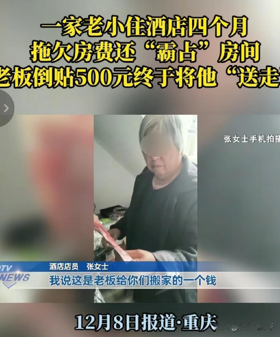 找媒体曝光还真有用 , “酒店老赖”吴先生一家终于搬离酒店。 重庆某酒店老板遭遇这烦心事困扰了她 好几月。 顾客吴先生带着80岁的老妈和10岁的儿子住进酒店, 起初还交房费,后来就以没钱为由不再交费,累计欠下4000多元,赖在酒店里不走。 酒店老板没办法只能向吴先生妥协,只要吴先生一家搬离酒店,欠下的4000多房费不但不收并且还愿意反给对方500块。 没想到吴先生同样不愿搬离 ,还说不交房费属于经济纠纷 ,不服就去法院起诉,还说老板算哪把夜壶。 吴先生不交费的理由是他现在没钱, 等他打官司把别人的欠账收回来就会结清房费 。 没办法,酒店老板就向天天630寻求帮助,电视台将记者采访报道播出以后, 引起了舆论关注。 酒店老板告诉630记者 ,新闻报道以后,吴先生可能感受到了一定的压力, 当天晚上吴先生一家开始收拾行李 , 终于搬离了酒店,老板也信守承诺,没收吴先生的房费,还给了500块钱。 不过吴先生并没有将行李一次搬完,还留下了少许物品,老板打电话给吴先生,吴先生答应会尽快来搬,还说不搬对不起你的好心。 酒店老板的善意,可能真的感动了吴先生 ;吴先生带着80岁的老母和10岁的儿子 ,也有可能,吴先生确实遇到了困难 , 不得已做出“老赖”行为。 事情最终得到圆满解决, 还是得益于酒店老板遇到特殊情况愿意取舍让步。 吴先生这种老赖,在生活中遇上是小概率事件, 示弱退让, 避免了矛盾升级 , 对酒店可能反而是一件好事 。