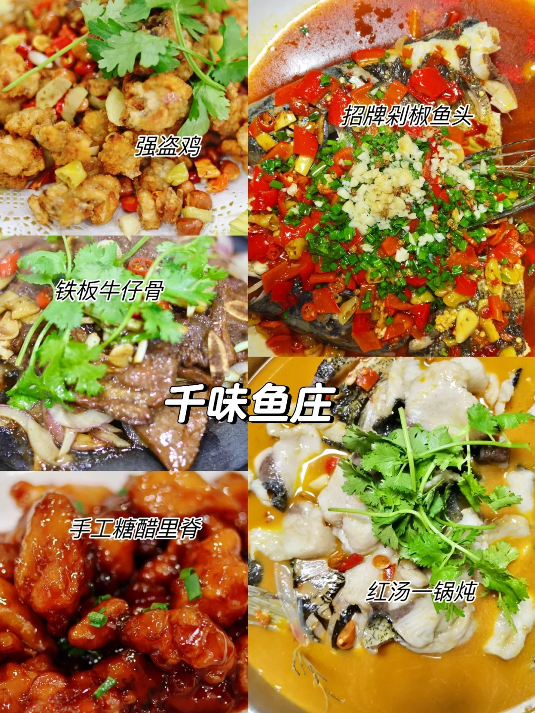 5️⃣千味鱼庄:这家店都是活鱼现杀,价格公道,推荐招牌剁椒鱼头,红汤一锅炖,强盗鸡,铁板牛仔骨,糖醋里脊等。