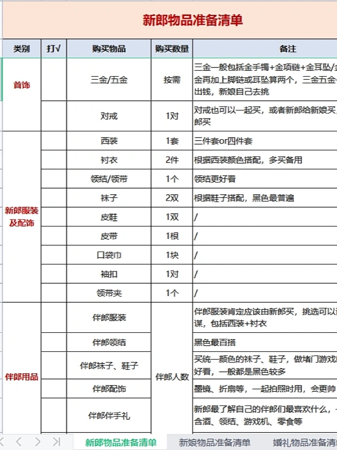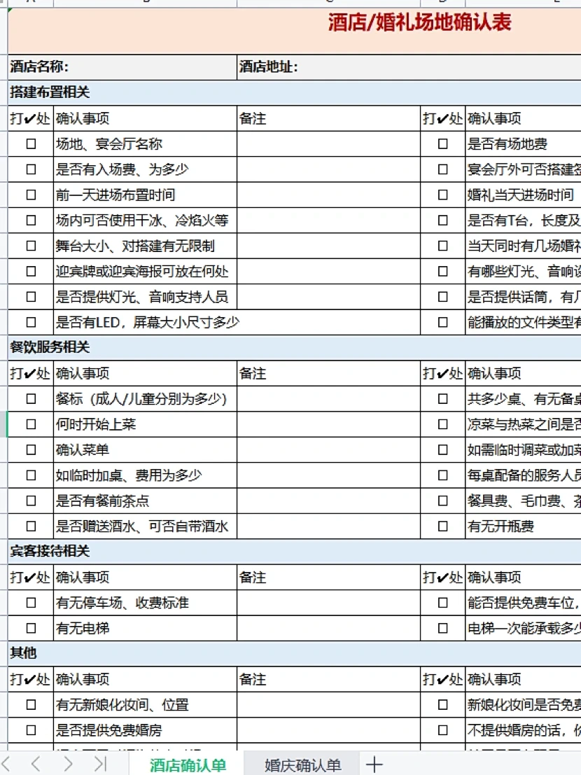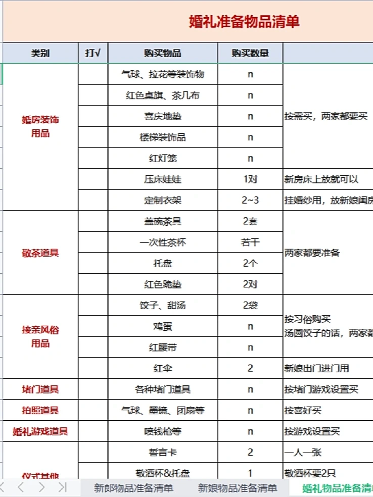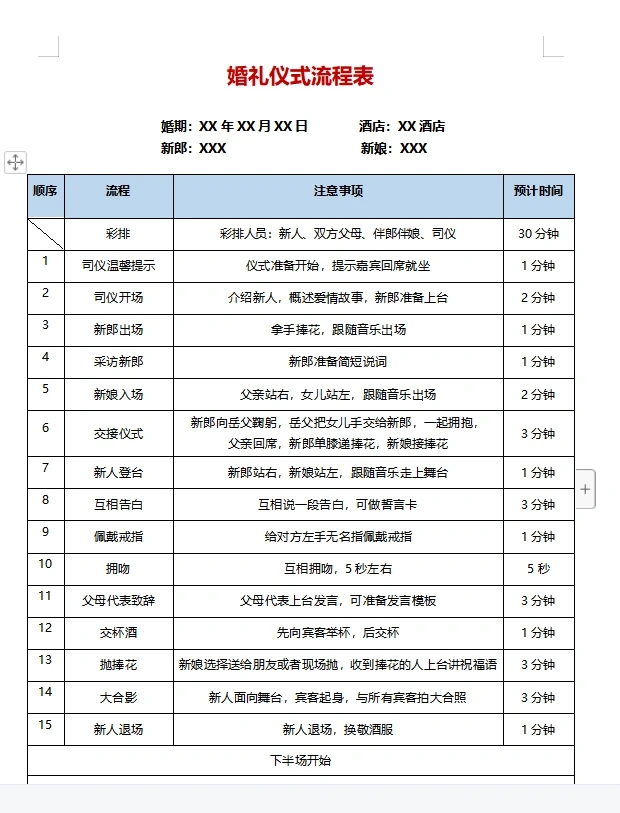 👉🏻经验总结!备婚真的是一件麻烦又幸福的事!现在越来越多的小伙伴备婚中也喜欢做一些表格文档,可以让自己乱中有序。🥳 🎈我整理了自己备婚过程中用过的一些表格文档,包含婚礼流程表、备婚物品清单表、婚礼人员分工表等及婚礼誓词、接亲堵门流程等文档。 🌈近期备婚的姐妹比较多,有需要的可以收藏备用。所有文档均作为参考,大家可根据当地婚俗自行修改调整。 🎈另外截图非完整版,需要完整电子版表格可私信发送哦![偷笑R]