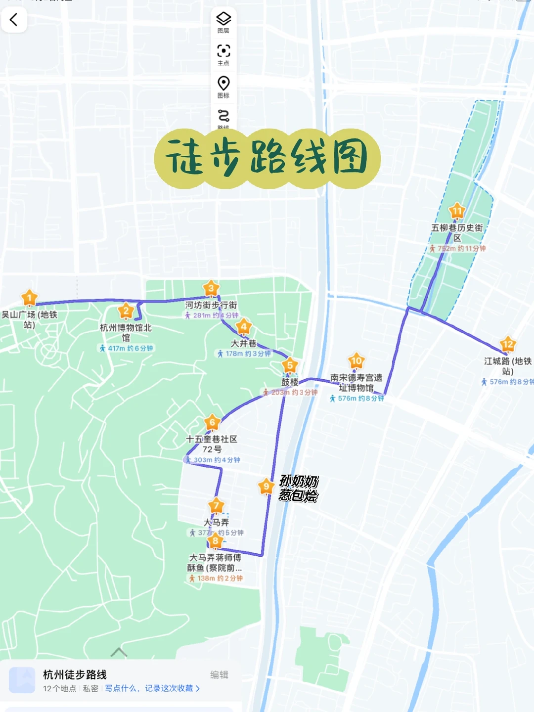 🗺️徒步路线推荐:吴山广场➡️杭州博物馆➡️河坊街➡️大井巷➡️鼓楼➡️十五奎巷➡️大马弄➡️中山南路➡️德寿宫➡️五柳巷