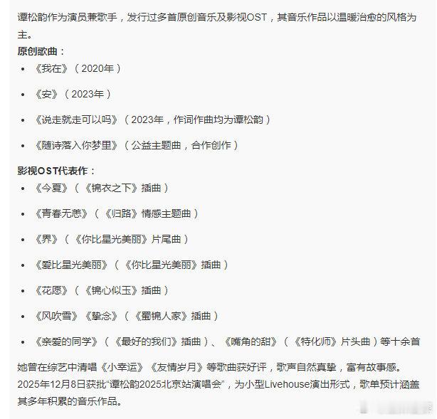 谭松韵音乐作品谭松韵唱功谭松韵音乐作品:有原创歌曲,也有影视ost代表作,开一场演唱会绰绰有余了,支持多唱,爱听