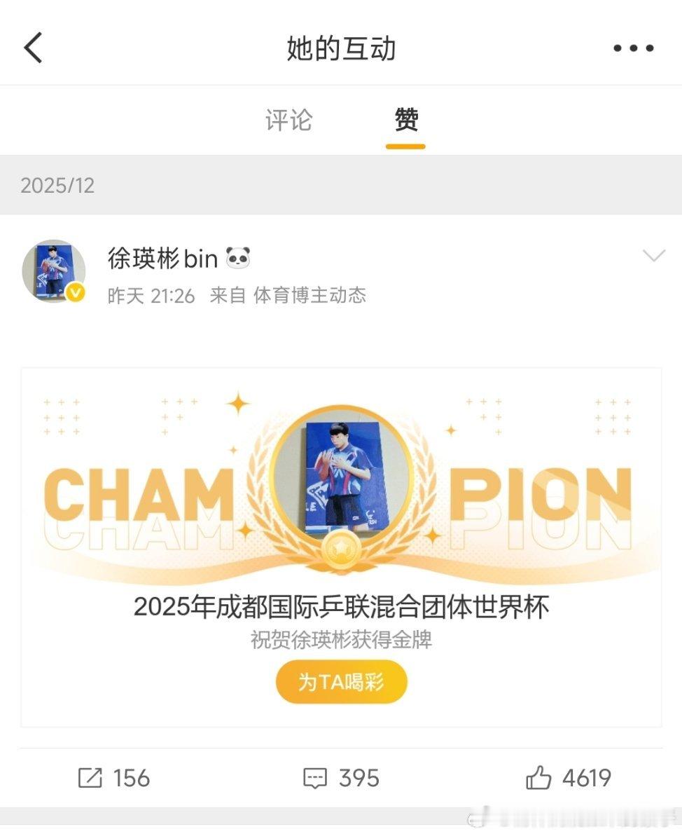 木原美悠点赞了徐瑛彬成都混合团体世界杯夺冠的动态👍🏻