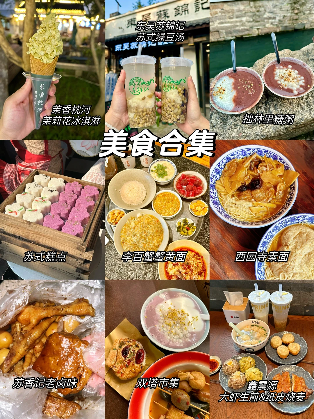 【平江路】梅月轩(梅花糕)、苏香记/鸡脚旮旯(苏式老卤味)、茉香枕河(茉莉花冰淇淋)、拙林里(桂花糖粥、赤豆糊圆子)、东吴苏锦记(苏式绿豆汤)、哑巴生煎、姜记面拖大排等;