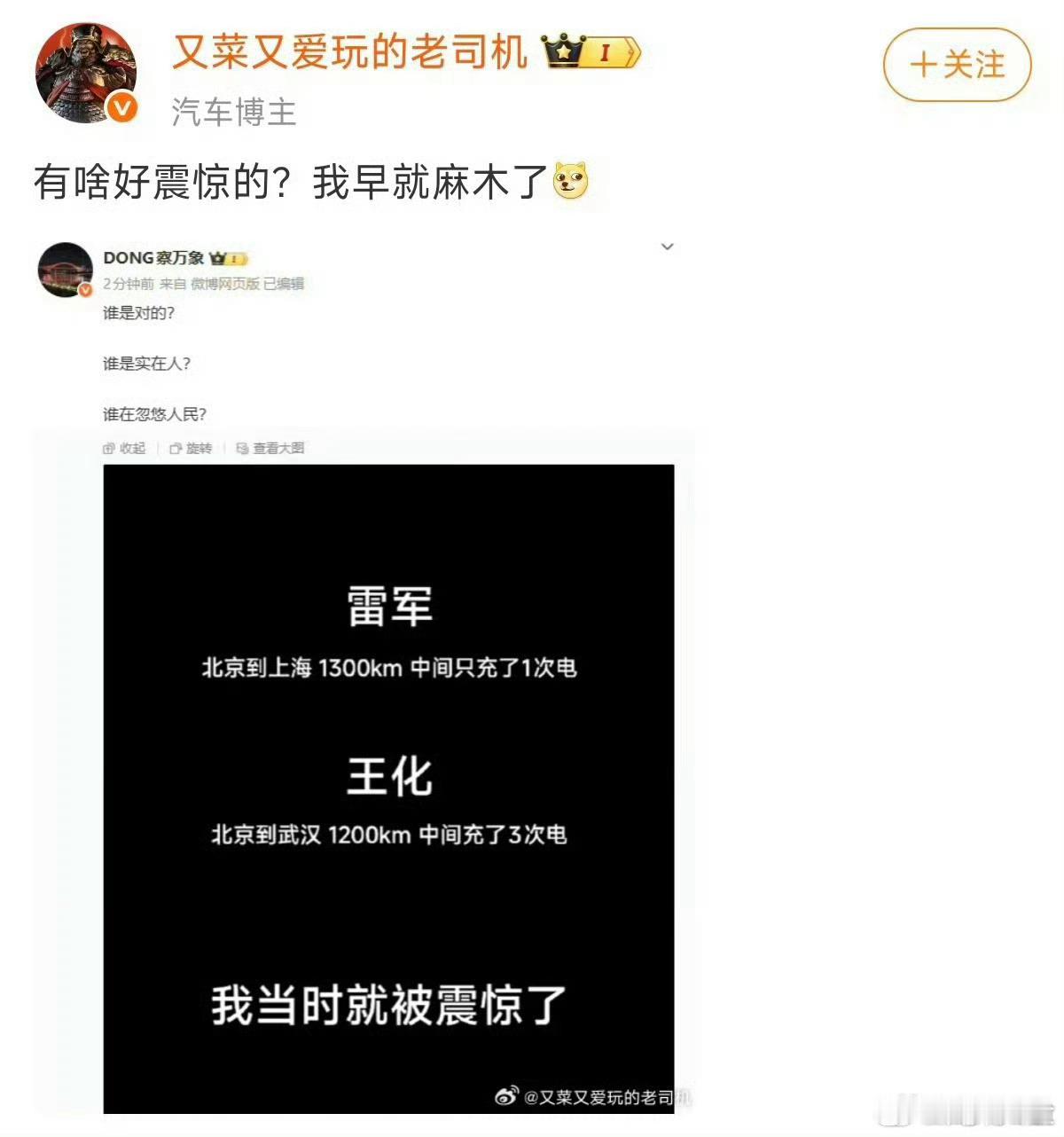 又开始带节奏断章取义了,两人使用的情况不一样,而且充电的方式也完全不一样,雷总是尽量将电量跑完,然后一次充满再开始跑,800+km续航能力的小米YU7完全可以只充电一次就跑完全程…至于化爷,每次该到服务区休息的时候,就顺便将电补一下,车本身剩余的电就多,此时能充多少是多少,所以休息三次充了三次,两者根本没有可比性,断章取义真是闹麻了,这跟带节奏雷总说N部手机测试30万小时,被断章取义成1部测试30万小时没啥区别…