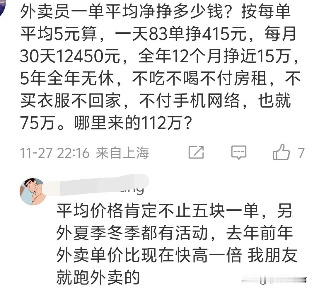 上海外卖员这么赚钱吗?5年攒112万元,每天不停跑外卖,甚至牺牲睡眠时间,这么辛苦,一般人也做不到。 上海外卖员的故事 “00后”25岁的外卖骑手张学强,在上海跑外卖5年攒下112万,(每天早上10: 30到晚上11:30) ,曾因开早餐店欠债5万元,改行做外卖骑手,未来想再尝试开店。 26岁外卖小哥三年挣102万元,收入最高时月入6万,一天仅睡3小时。 网友:外卖员一单平均净挣多少钱?按每单平均5元算,一天83单挣415元,每月30天12450元,全年12个月挣近15万,5年全年无休,不吃不喝不付房租,不买衣服不回家,不付手机网络,也就75万。哪里来的112万? 网友:平均价格肯定不止五块一单,另外夏季冬季都有活动,去年前年外卖单价比现在快高一倍,我朋友就跑外卖的。
