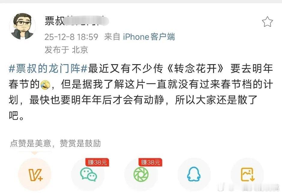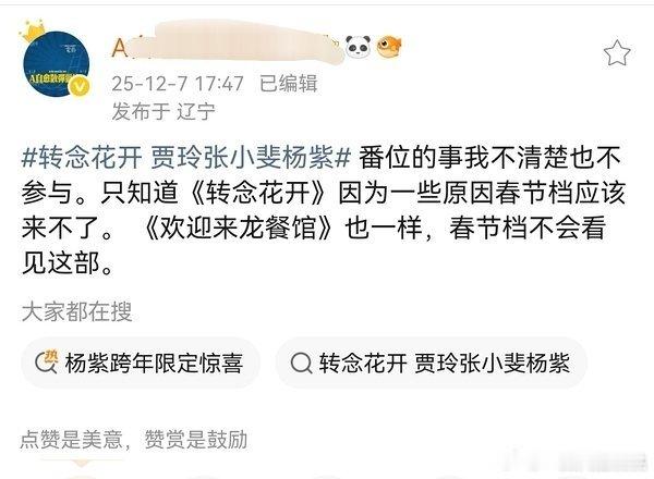 不止一个电影博主说转念花开不来春节档了,龙餐馆也不来,春节档一下空出两部大片