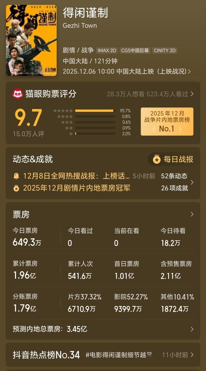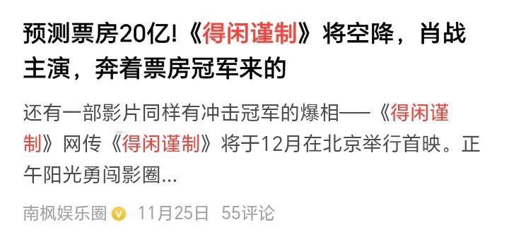 一觉醒来,肖战太让人失望了! 肖战主演的电影《得闲谨制》今天是第四天了,我刚一醒来,就去看了下票房数据,2亿不到。 我还特别看了一下平台对这部电影的总票房预测,3.45亿! what?只有这么点吗?之前不是预测20亿的吗?不是说肖战杀疯了了吗?不是说肖战一人力扛整个贺岁档吗?怎么只有这么点票房呢? 说实话,最开始公布这部电影名字的时候,我就觉得莫名其妙,这是什么片名啊,莫名其妙,完全看不出要讲什么! 我又看了一下观众反馈,果然有人和我一样的感受,觉得有种好东西被糟蹋的感觉,不知道名字谁取的,看名字就不想去。 当然就内容来说,也是吐槽的比较多,说是一部烂片,有点垃圾,看了一半就走了! 哎。《得闲谨制》这样的结果,让很多喜欢肖战的人失望了!