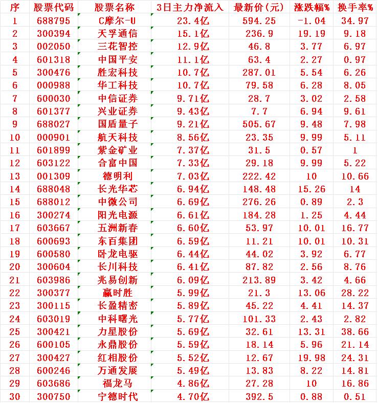 12月9日,前3天主力大幅买入的30名单! 摩尔-U:3日主力净流入 23.4亿元,涨跌幅 -1.04%,换手率 34.97% 天孚通信:3日主力净流入 15.1亿元,涨跌幅 +19.19%,换手率 9.18% 三花智控:3日主力净流入 12.9亿元,涨跌幅 +3.77%,换手率 6.97% 中国平安:3日主力净流入 11.1亿元,涨跌幅 +2.27%,换手率 0.97% 胜宏科技:3日主力净流入 10.7亿元,涨跌幅 +5.54%,换手率 6.26%