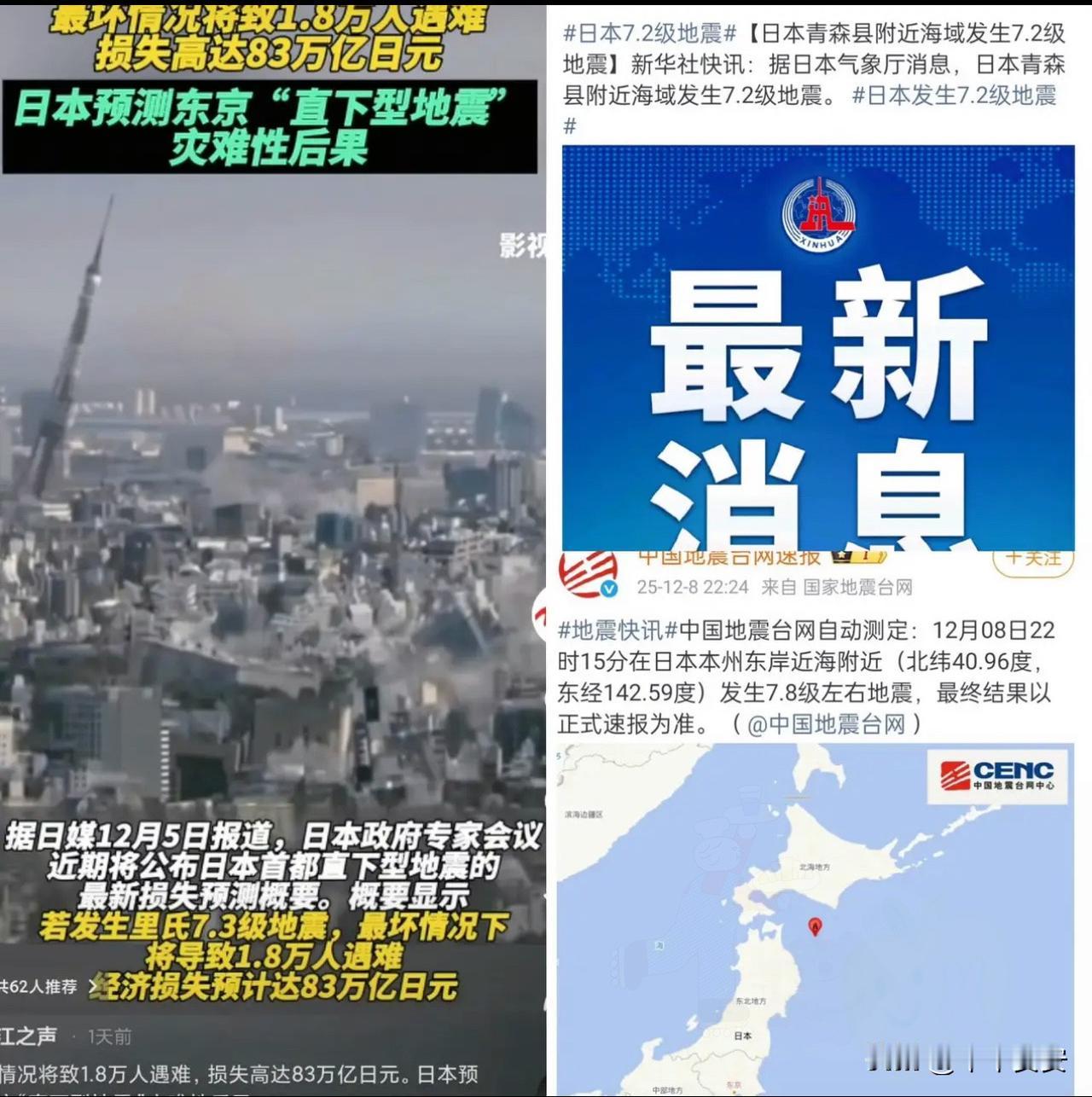 青森这次地震 太突然,太恐怖了[恐惧] 日本青森县附近海域发生7.6级强震 海啸预警已解除 北京时间12月8日22时15分,日本青森县附近本州东部海域(北纬41.00度,东经142.35度)发生强震,中国地震台网测定震级为7.5级,日本气象厅后续修正为7.6级,震源深度50千米(日方曾调整为54千米)。 地震造成东京都及青森、岩手等地有明显震感,部分区域摇晃持续超20秒。当地时间8日23时33分,青森县东部近海发生5.6级余震,目前暂无更大余震报告。 地震发生后,日本气象厅迅速发布海啸警报,预计东北部部分海域可能出现高达3米的海浪,随后于9日凌晨下调为“海啸注意”级别,清晨6时20分解除全部预警。实际观测到的最高海啸浪高为岩手县久慈港的70厘米,未达预测极值。 应急响应方面,日本首相官邸设立紧急灾害对策室,自卫队启动灾害应对机制,NHK电视台中断常规节目进行紧急直播,呼吁沿岸民众撤离。截至目前,超12万沿岸居民已被疏散,仅青森县八户市一家酒店有多名工作人员受伤送医,暂无人受重伤。包括女川核电站、北海道泊核电站在内的周边核设施经排查无异常,福岛第一核电站已暂停核污染水排海作业。 此前引发关注的“1.8万人遇难”预测,实为针对东京可能发生的7.3级直下型地震的最坏情景评估,与本次地震无关,相关信息已澄清。日本气象厅提醒,未来72小时仍需警惕5级以上余震风险。 祈愿沿岸民众平安避险,灾情后续将持续跟进。 各位读者你们怎么看?日本海地震风险 日本大地震 日本地震海啸 日本强震警报